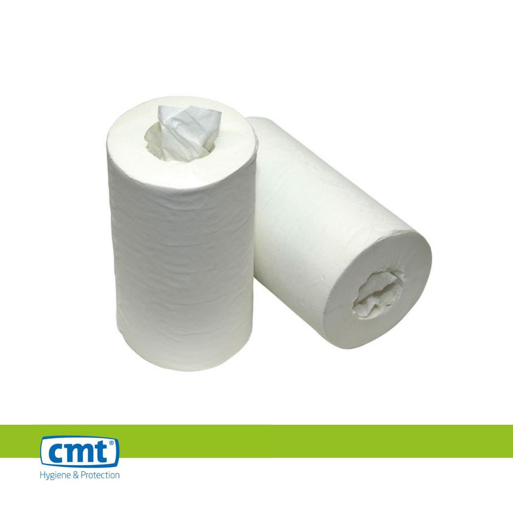 CMT centerfeed Poetsrol Mini 1-laags Cellulose Wit zonder koker. 12rol per doos. Afmeting rol : 115m x 20cm. Voorzien van EU Ecolabel en FSC keurmerk. Afmeting omdoos : 590x400x210mm. Geschikt voor dispenser 431105 _ 431155