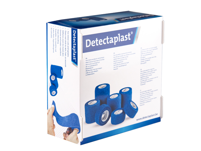 * Zelfhechtend verband, blauwe kleur, volgens HACCP, BRC, voor langdurige en betrouwbare druk, vervaardigd uit een poreus, non-woven polyester materiaal dat enkel aan zichzelf kleeft en niet aan de huid of de haren, kan afgescheurd worden op maat, geen schaar nodig, water- en vetafstotend.