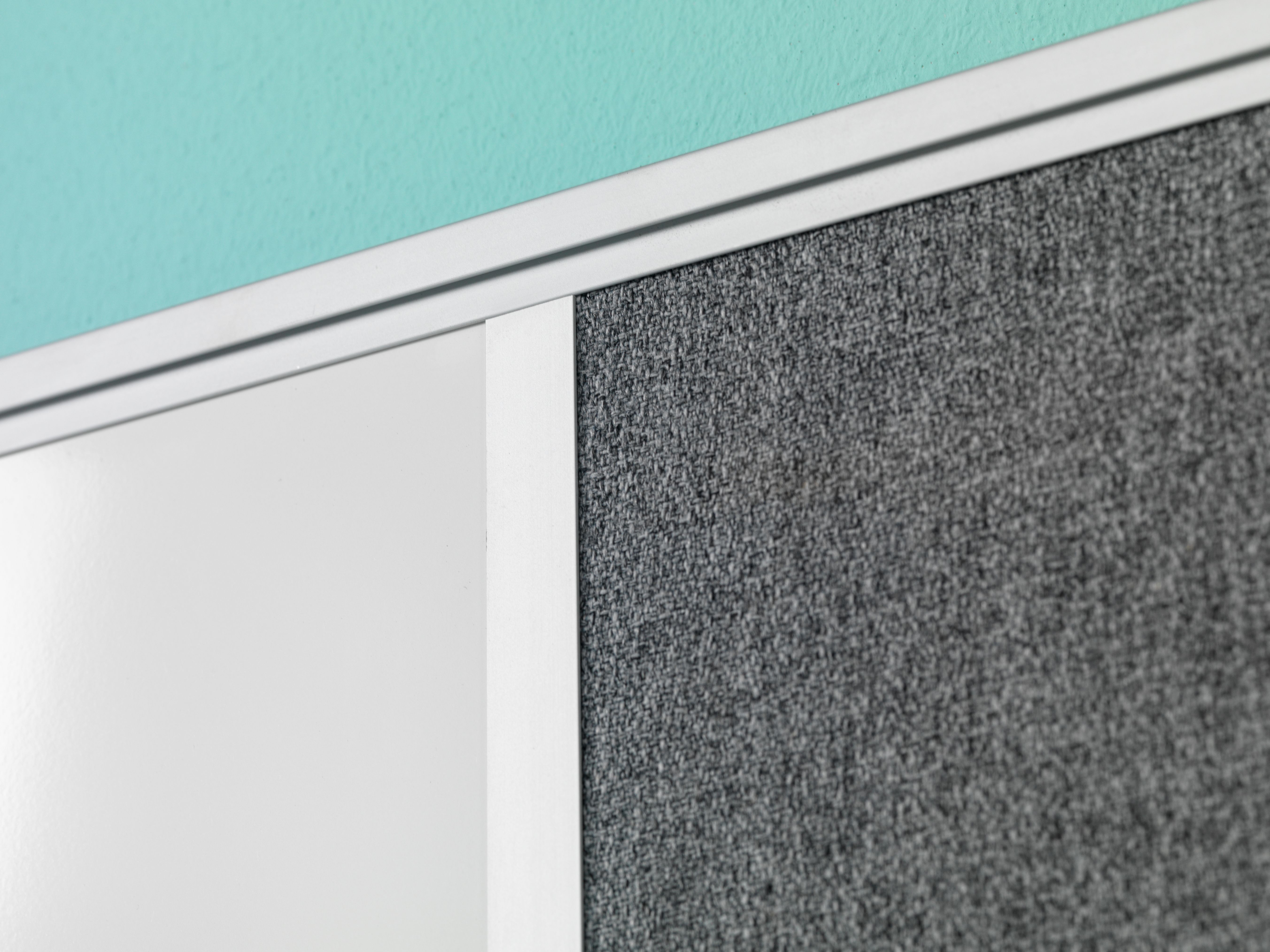 Combinatie van een wit emailstalen whitebord (magneethoudend en droog uitwisbaar) en een Camira prikbord. Andere stofkleuren op aanvraag. Voorzien van een geanodiseerd softline profiel met grijze kunststof hoekstukken. Inclusief ophangmateriaal.