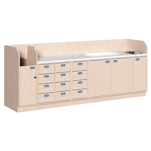 Of het nu gaat om een enkele commode of als een grote commodecombinatie - in ieder geval bieden de verschillende elementen van de commode duurzame materialen, geteste veiligheid, ergonomische afmetingen en veel opbergruimte. Aan drie zijden omringen veiligheidsopstanden het werkblad, dat is voorzien van een waterdichte coating en aan de voorzijde is afgerond voor gebruiksgemak. Dankzij de ingebouwde handgrepen en de verzonken basis kunt u dicht bij de kleedruimte komen. Als uitrusting zijn verschillende varianten van rugvriendelijke klimhulpmiddelen, lades, kinderbadjes en fonteinen verkrijgbaar. Als optie is een bijzonder waterdichte basisvariant verkrijgbaar. U kunt kiezen uit twee verschillende werkdieptes en rechts/links uitvoeringen van de kasten. Het aankleedkussen moet apart besteld worden.