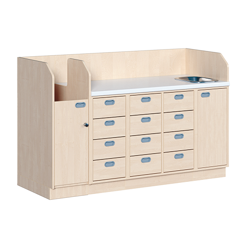 Of het nu gaat om een individuele commode of als een grote commodecombinatie - in ieder geval bieden de verschillende elementen van de commode duurzame materialen, geteste veiligheid, ergonomische afmetingen en veel opbergruimte. Aan drie zijden omringen veiligheidsopstanden het werkblad, dat is voorzien van een waterdichte coating en aan de voorzijde is afgerond voor gebruiksgemak. Dankzij de ingebouwde handgrepen en de verzonken basis kunt u dicht bij de kleedruimte komen. Als uitrusting zijn verschillende varianten van rugvriendelijke klimhulpmiddelen, lades, kinderbadjes en fonteinen verkrijgbaar. Als optie is een bijzonder waterdichte basisvariant verkrijgbaar. U kunt kiezen uit twee verschillende werkdieptes en rechts/links uitvoeringen van de kasten. Het aankleedkussen moet apart besteld worden.