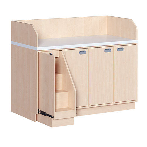 Of het nu gaat om een individuele commode of als een grote commodecombinatie - in ieder geval bieden de verschillende elementen van de commode duurzame materialen, geteste veiligheid, ergonomische afmetingen en veel opbergruimte. Aan drie zijden omringen veiligheidsopstanden het werkblad, dat is voorzien van een waterdichte coating en aan de voorzijde is afgerond voor gebruiksgemak. Dankzij de ingebouwde handgrepen en de verzonken basis kunt u dicht bij de kleedruimte komen. Als uitrusting zijn verschillende varianten van rugvriendelijke klimhulpmiddelen, lades, kinderbadjes en fonteinen verkrijgbaar. Als optie is een bijzonder waterdichte basisvariant verkrijgbaar. U kunt kiezen uit twee verschillende werkdieptes en rechts/links uitvoeringen van de kasten. Het aankleedkussen moet apart besteld worden.