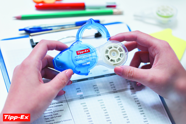 Tipp-ex is een produkt waarmee je type en schrijffouten kunt corrigeren. Deze Duitse fabrikant is in 1959 gestart met de produktie in correctiemiddelen. Het eerste produkt van tipp-ex was een correctiepapiertje met aan 1 zijde een witte stof. Door de foutieve letter nogmaals te typen en dit velletje er dan voor te houden, werd de eerder getypte letter niet meer zichtbaar en kon je de juiste letter ervoor in de plaats typen. In 1965 is de vloeibare versie op de markt gebracht, Net witte verf waar je na het aanbrengen en drogen van de vloeistof weer overheen kunt schrijven of typen. Tegenwoordig zijn het blanco rollers die we inmiddels 't meeste verkopen.