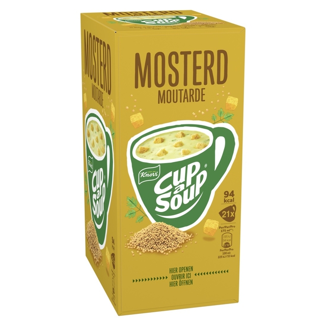 Knorr Cup-a-Soup Mosterd . * Bevat 21 zakjes voor 21 heerlijke mokken soep . * 94 calorieën per mok . * Zonder toegevoegde smaakversterkers, kunstmatige kleurstoffen en conserveermiddelen . * Eenvoudig en snel te bereiden . * Een heerlijk tussendoortje .