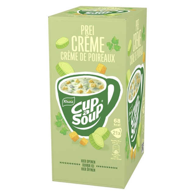 Knorr Cup-a-Soup Prei Crème . * Bevat 21 zakjes voor 21 heerlijke mokken soep . * 65 calorieën per mok . * Zonder toegevoegde smaakversterkers, kunstmatige kleurstoffen en conserveermiddelen . * Geschikt voor vegetariërs . * Een heerlijk tussendoortje .