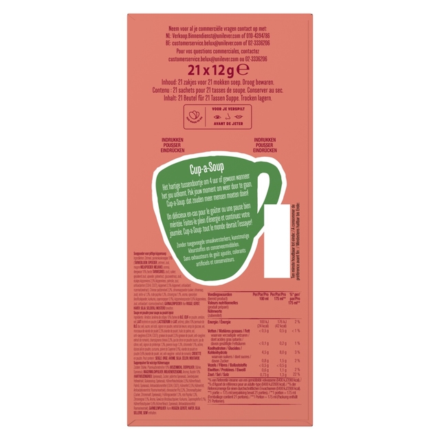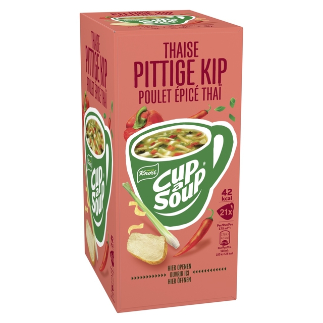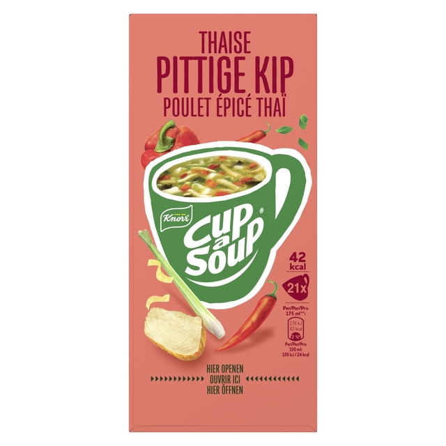 Knorr Cup-a-Soup Thaise Pittige Kip . * Bevat 21 zakjes voor 21 heerlijke mokken soep . * 41 calorieën per mok . * Zonder toegevoegde smaakversterkers, kunstmatige kleurstoffen en conserveermiddelen . * Eenvoudig en snel te bereiden . * Een heerlijk tussendoortje .