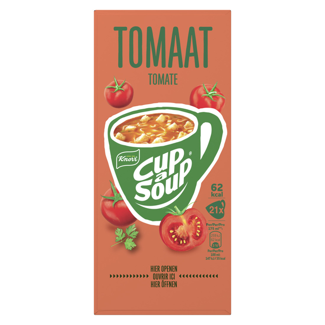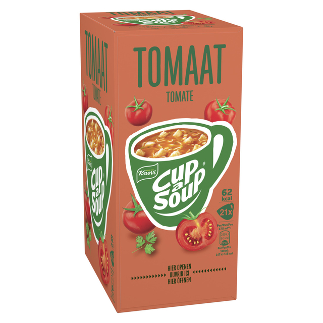 Knorr Cup-a-Soup Tomaat . * Bevat 21 zakjes voor 21 heerlijke mokken soep . * 61 calorieën per mok . * Zonder toegevoegde smaakversterkers, kunstmatige kleurstoffen en conserveermiddelen . * Geschikt voor veganisten . * Een heerlijk tussendoortje .