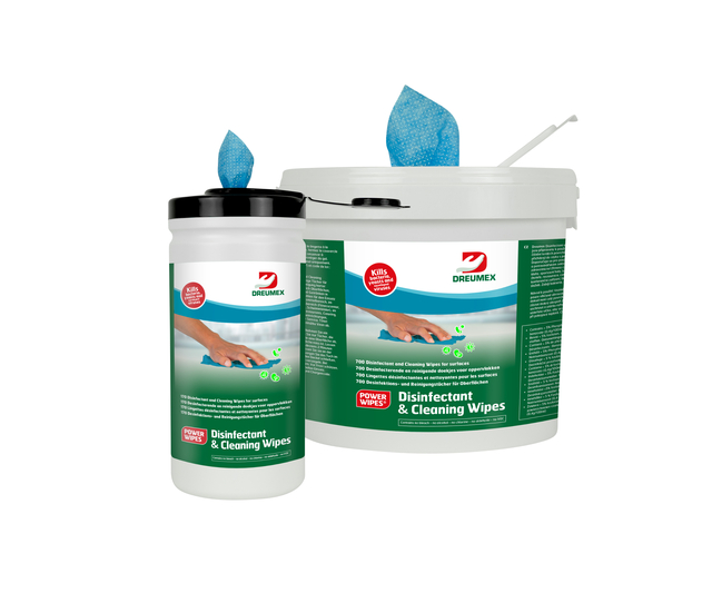 * Dreumex Disinfectant and Cleaning Wipes Blue zijn gebruiksklare doekjes die tegelijkertijd reinigen en desinfecteren. Dit bespaart u tijd en middelen, omdat u slechts één product nodig hebt. Het kleine formaat is ideaal voor het reinigen en desinfecteren van kleine, harde oppervlakken en tools zoals messen, thermometers, tangen, handgrepen, mixers, blenders en snijmachines. Onze desinfecterende en reinigende doekjes bevatten geen agressieve chemicaliën zoals bleekmiddel, chloor, alcohol, aldehyde of VOC. Bovendien zijn Dreumex Disinfectant and Cleaning Wipes Blue dermatologisch getest en goedgekeurd, waardoor ze zonder handschoenen te gebruiken zijn voor de desinfectie van oppervlakken. * De structuur van de wipes maakt het gemakkelijk om vuil te verwijderen en tevens doden ze bacteriën, gisten en omkapselde virussen. * Na het verwijderen van vuil, moeten oppervlakken 2 minuten nat blijven. Naspoelen is niet nodig, wat een aanvullend voordeel van tijdwinst oplevert. * Dreumex Disinfectant and Cleaning Wipes Blue zijn PT2 en PT4 geclassificeerd, dus perfect voor de voedingsindustrie. * Toelatingsnummer: EU-0018737-0001 PT2 en PT4 geclassificeerd * Doodt bacteriën, gisten en omkapselde virussen zonder alcohol * Ideaal doekje voor het reinigen en desinfecteren van kleine, harde oppervlakken en tools in de voedingsindustrie * Dermatologisch getest en goedgekeurd: zonder handschoenen te gebruiken voor oppervlakken * Afmeting doek: 130 x 140 mm * In een handige dispenserbus