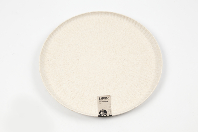 Rond dienblad met een diameter van 30cm en een geplooid patroon gemaakt van bamboevezels. Bamboe vezel met 20% polymeerbindmiddel is een milieuvriendelijk product dat eenvoudig gedecoreerd kan worden met acrylverf, porseleinstiften, enz. Vorstbestendig tot -21° C . Hoogte rand: 2cm.