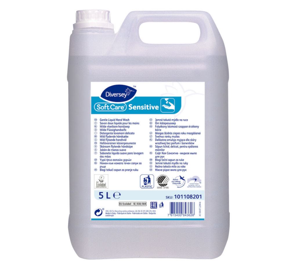 Soft Care Sensitive is een milde geur- en kleurstofvrije handwaszeep speciaal ontwikkeld voor gebruik in de voedingsmiddelenbranche en voor de gevoelige huid. Tevens geschikt voor gebruik als shampoo en lichaamsreiniging. De Soft Care Sensitive is een goede oplossing voor gebruikers die frequent handen wassen. Soft Care Sensitive heeft een uitstekend hydraterend vermogen waardoor de handen gezond en schoon aanvoelen. Soft Care Sensitive is gebaseerd op een systeem van milde oppervlakteactieve bestanddelen zonder kleurstoffen of parfum. Het anionische amfotere systeem van oppervlakte-actieve stoffen staat garant voor een uitstekende verwijdering van vettig vuil. De milde samenstelling en de afwezigheid van parfum en kleurstoffen maken het product bijzonder geschikt voor het frequent wassen van gevoelige handen geen huidirritatie of uitdrogen. Daarenboven beschermen de hydraterende bestanddelen de huid. Soft Care Sensitive bevat geen parfum waardoor het aangewezen is voor gebruik in de voedselverwerkende industrie. Eco-gecertificeerd met EU Flower Ecolabel en Nordic Swan Ecolabel. Soft Care Sensitive werd geformuleerd volgens de Europse Cosmetica richtlijn en is dus veilig in gebruik indien toegepast volgens de gebruiksaanwijzing.