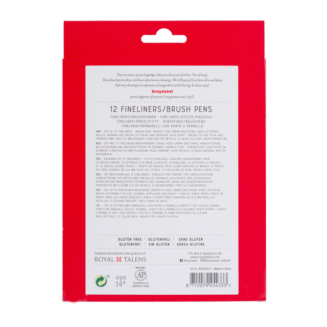 * De basisset van Bruynzeel Creatives betreft een set van 12 fineliners/brushpens. Ideaal voor urban sketching, handlettering, bulletjournaling, brushlettering en tekenen. * De fineliners van Bruynzeel Creatives hebben twee verschillende punten. Een flexibele penseelpunt voor dikke & dunnere lijnen en een duurzame plastic penpunt van 0.4 voor consistente lijnen en precieze details. * Dankzij de driehoekige vorm en de anti-roldop rollen ze niet gemakkelijk van je bureau. * De inkt is op waterbasis, dus geurloos, die niet door het papier drukt en snel droogt.