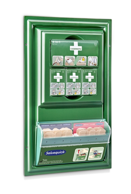 * Met Cederroth Eerstehulppaneelen vindt u altijd de noodzakelijke hulpmiddelen op hun plaats, met direct op de verpakkingen gedrukte duidelijke en gemakkelijk te begrijpen instructies. * Het Mini-eerstehulppaneel is een kleiner paneel met alleen pleisters en bloedstelpend verband. Past in kleinere ruimten of als aanvulling op een andere eerstehulpuitrusting. * Wanneer de pleister uit de automaat wordt getrokken laat de ene beschermende papierstrook los en kan de pleister met een enkele hand worden aangebracht. * Inhoud: 1 Cederroth 4-in-1 bloedstelpend verband 3 Cederroth 4-in-1 mini bloedstelpende verbanden 1 st. Salvequick Pleisterautomaat * Soort letsel: Bloedsomloop / Verstuikingen / Wonden.