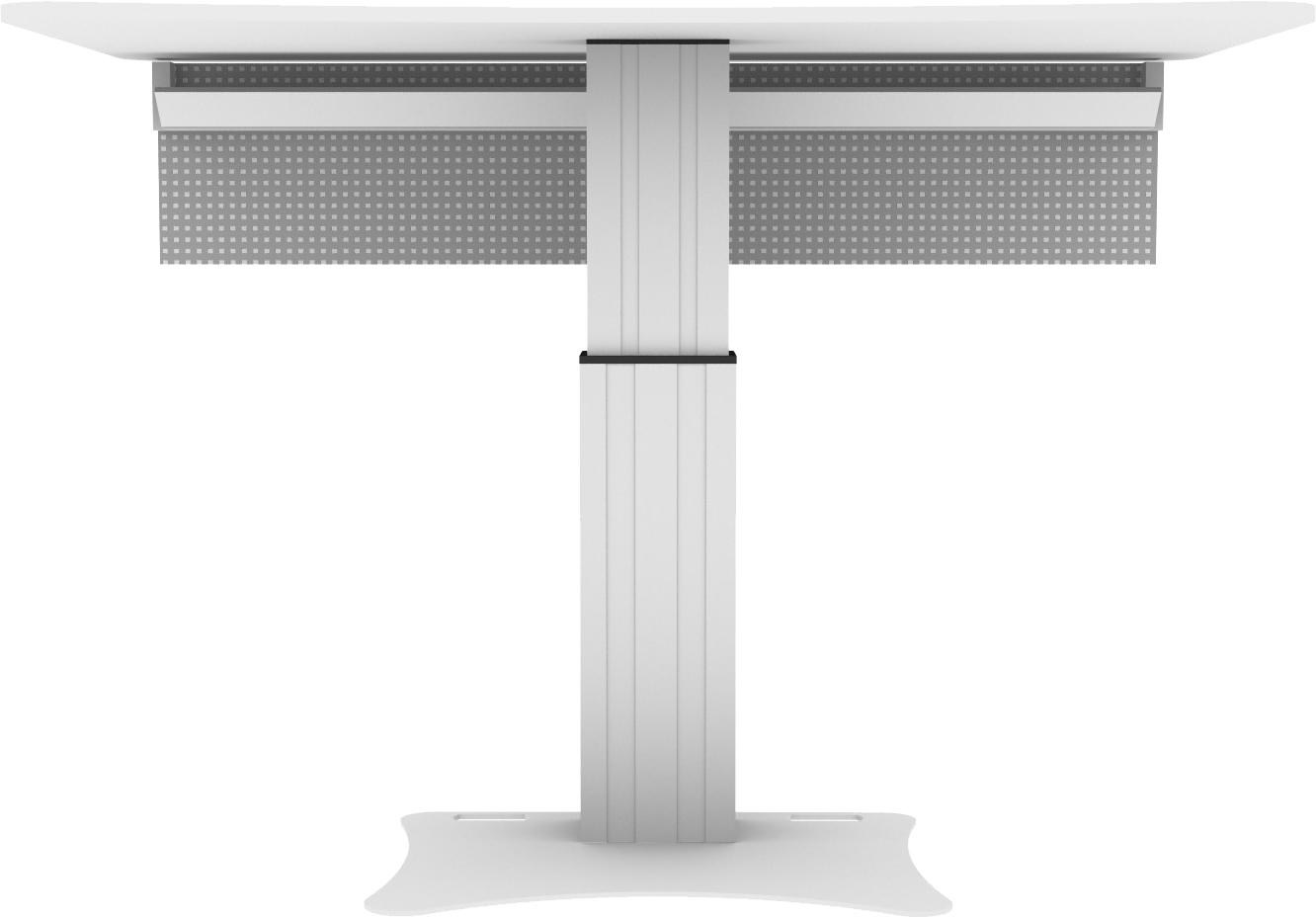 Elektrisch in hoogte verstelbaar bureau met 42 cm slag. Onze in hoogte verstelbare bureaus en lessenaars kunnen gebruikt worden als ergonomische sta- en zitwerkplekken en zijn voorzien van een 8 mm dikke voetplaat zodat het bureau of katheder stabiel in de ruimte kan staan. De elektrische hoogteverstelling werkt soepel en biedt een verstelbereik van 42 cm. Het elektrisch in hoogte verstelbare bureau is middels twee knoppen onder het bureau op de gewenste werkhoogte in te stellen. Werk rugvriendelijk, soms zittend en soms staand - zo minimaliseert u de dagelijkse belasting van uw tussenwervelschijven. Op zoek naar eigentijds, functioneel, degelijk en duurzaam AV-meubilair? Praat gewoon met ons! Wij nemen de planning van uw kamers van u over tot aan de inrichting en montage van het AV-meubilair.
