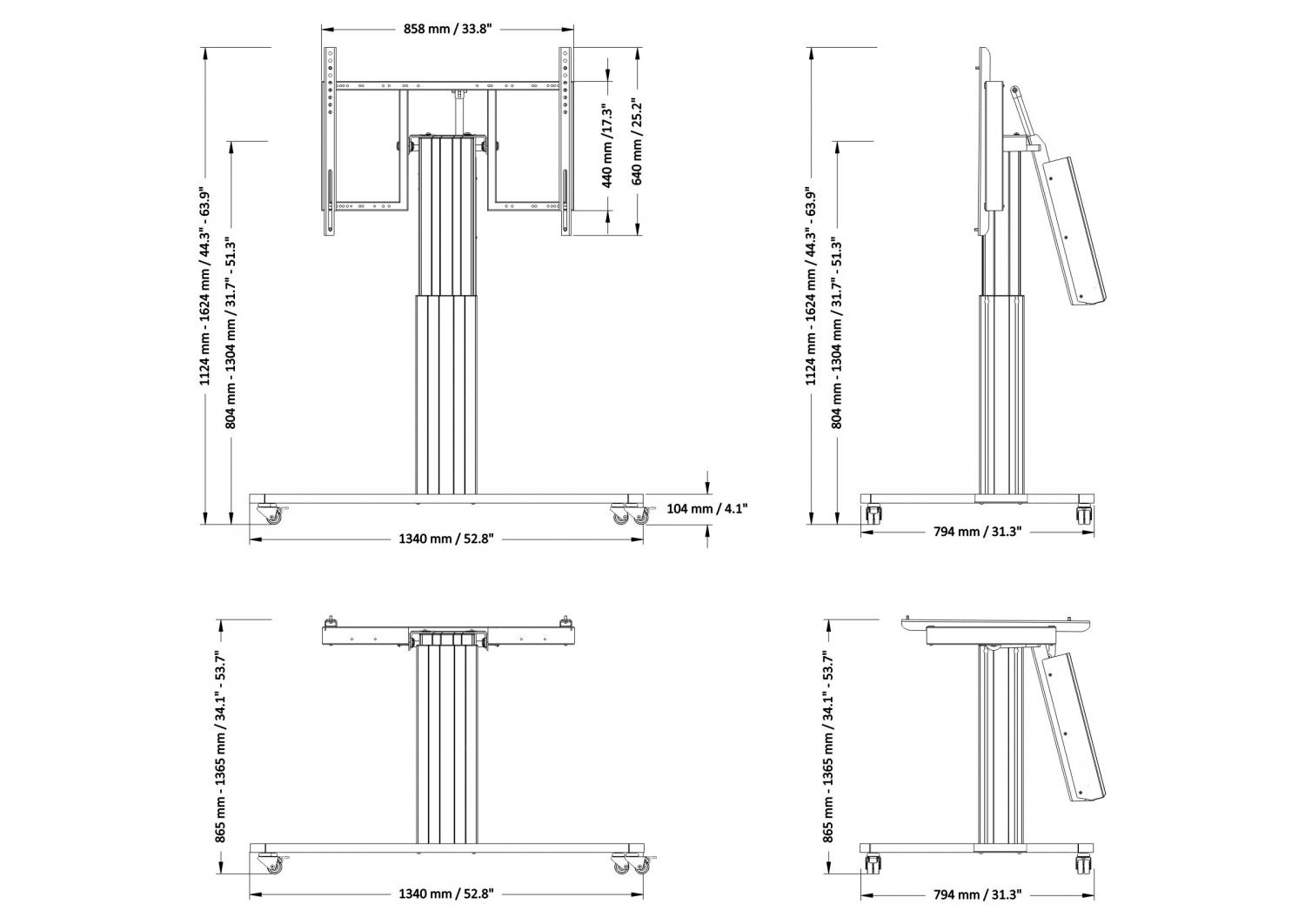 Elektrisch in hoogte verstelbare en kantelbare tv-trolley, verrijdbare monitorstandaard, 50 cm slag