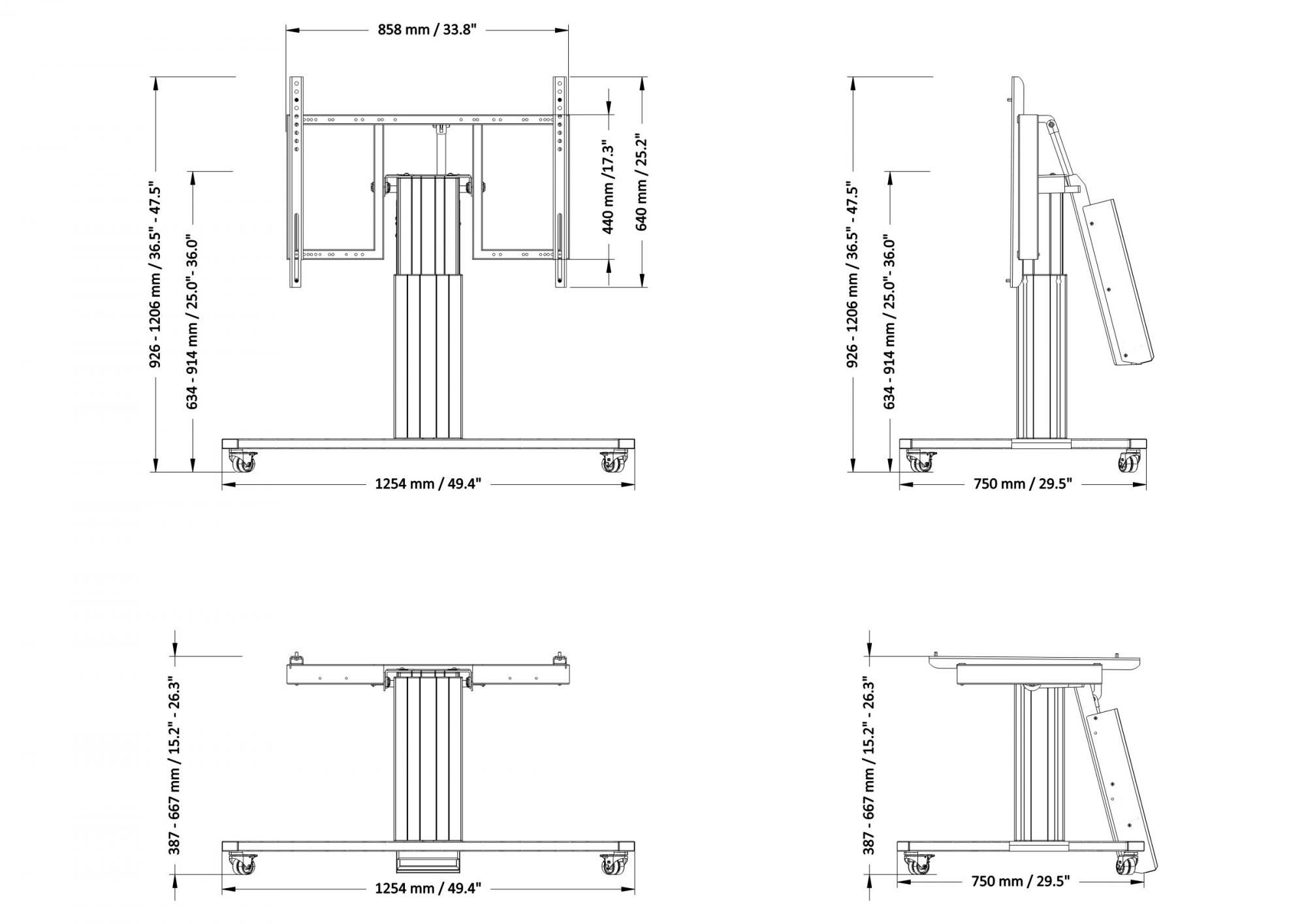 Elektrisch in hoogte verstelbare en kantelbare tv-trolley, verrijdbare monitorstandaard, slag 28 cm