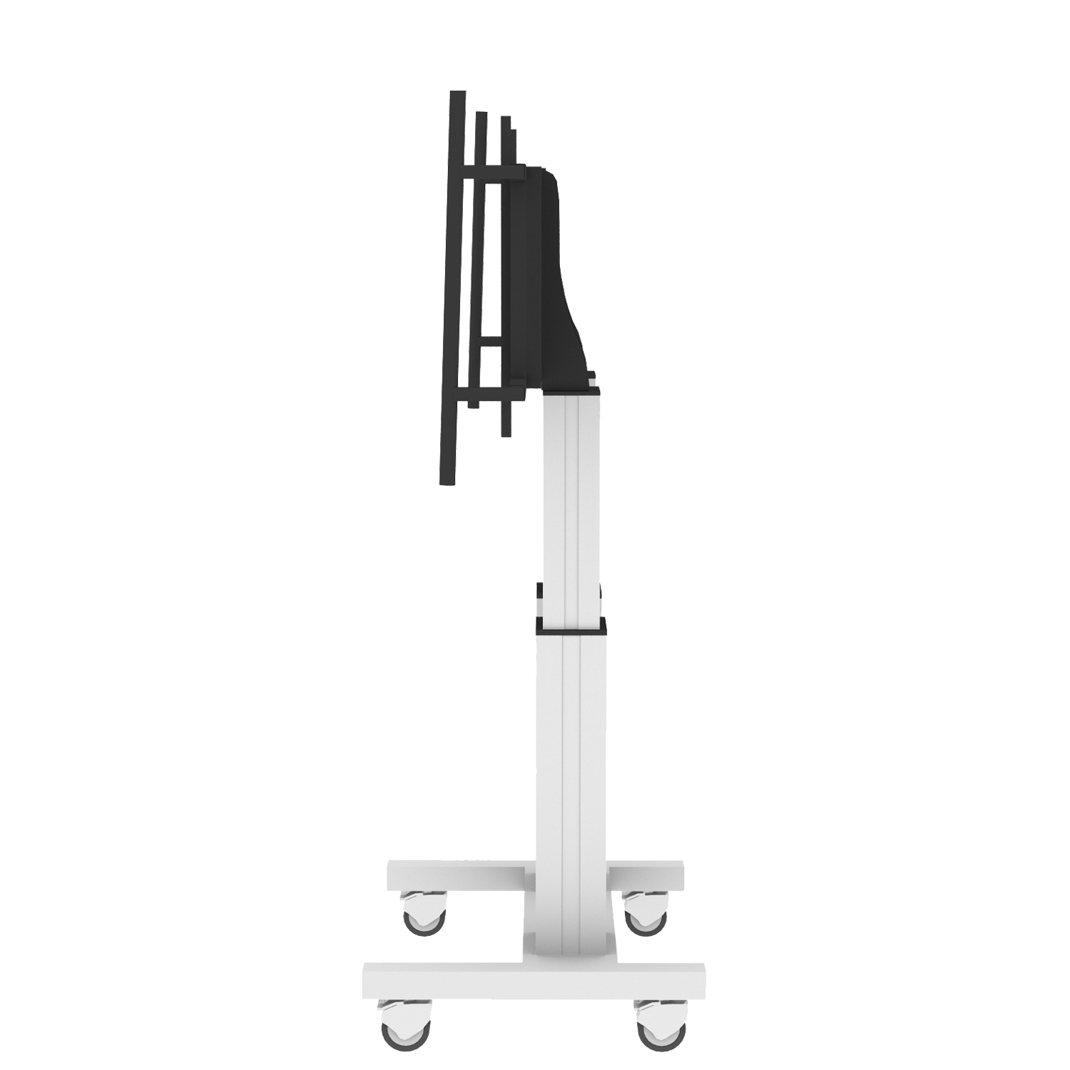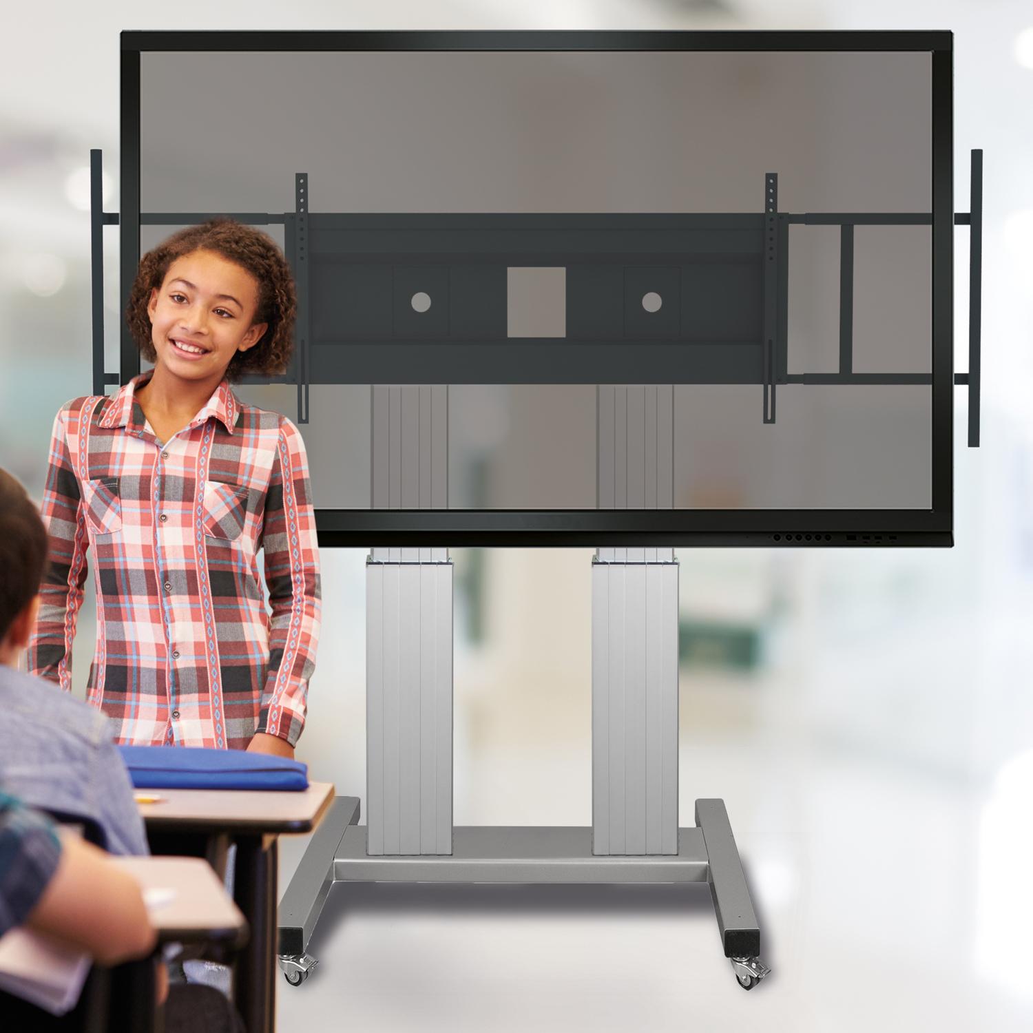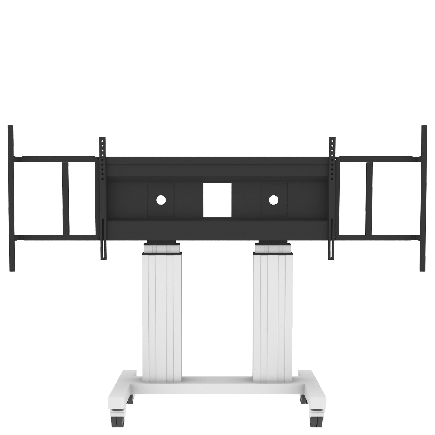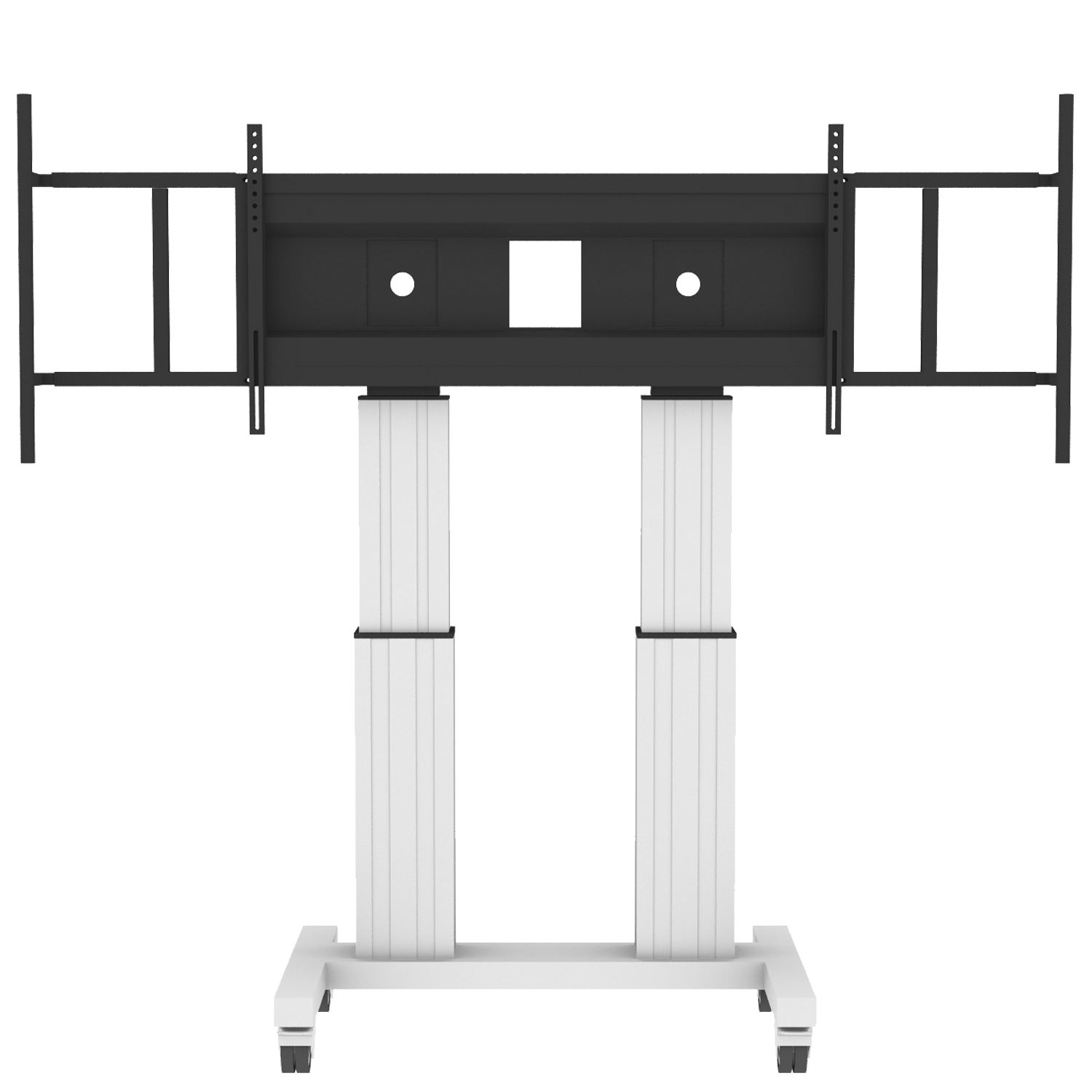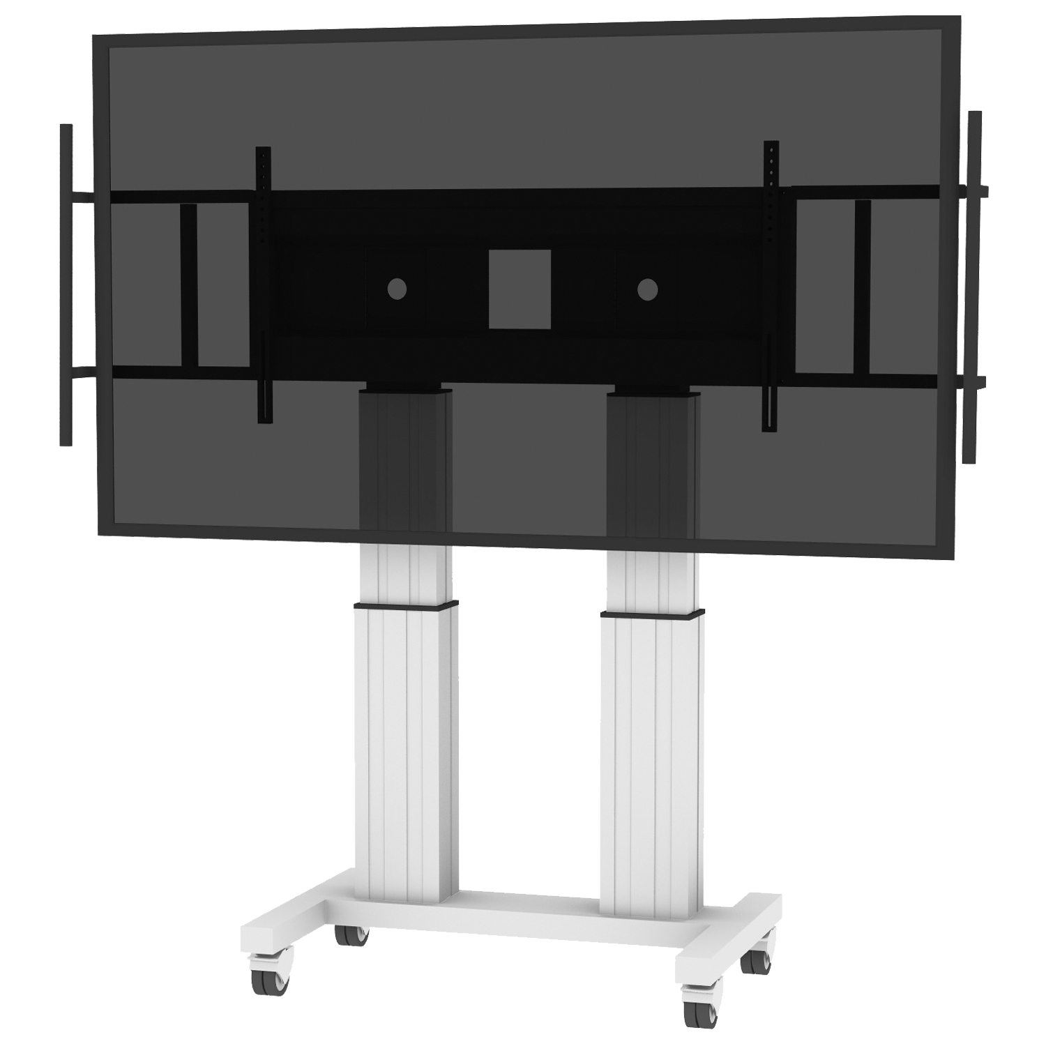 Elektrisch in hoogte verstelbare verrijdbare tv standaard met XL-frame voor het plaatsen van displays. De verrijdbare tv standaard is ontworpen voor gebruik met interactieve touchscreen-monitoren. De elektrisch in hoogte verstelbare verrijdbare tv standaard wordt geleverd met een extra brede displayhouder. De mobiele monitorstandaard is uitgerust met twee gemakkelijk telescopische mastkolommen met een hoogteverstelling van 50 cm. Twee handgrepen zijn inbegrepen. Het product wordt gedemonteerd geleverd en kan per pakketdienst worden verzonden.