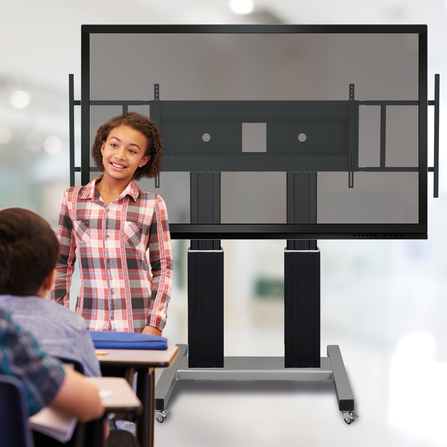 Elektrisch in hoogte verstelbare heavy duty XL tv-trolley, verrijdbaar monitorstatief met 50 cm slag en grote handgrepen