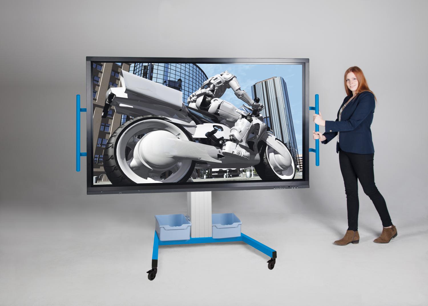 De Jolli monitorstandaard is de volgende generatie mobiele, in hoogte verstelbare tv-trolleys in het onderwijs. Elektrische, gebruiksvriendelijke hoogteverstelling - ook bij zware displays. De Jolli monitorstandaard is dankzij de grote wielen en stevige handgrepen super eenvoudig van kamer naar kamer te vervoeren. In de dozen is ruimte voor alles wat bij het systeem hoort. Om het zware schoolleven van alledag aan te kunnen, is het chassis van staal, robuust en stevig gelast. Dankzij de V-vormige voet kunnen kinderen heel dicht bij de Jolli monitorstandaard komen - ook als ze in een rolstoel zitten. Het hoogteverstelbereik is 50 cm, de centrale aluminium hefkolom wordt bediend via 2 knoppen die aan het systeem zijn bevestigd. In de dozen is ruimte voor alles wat bij het systeem hoort.