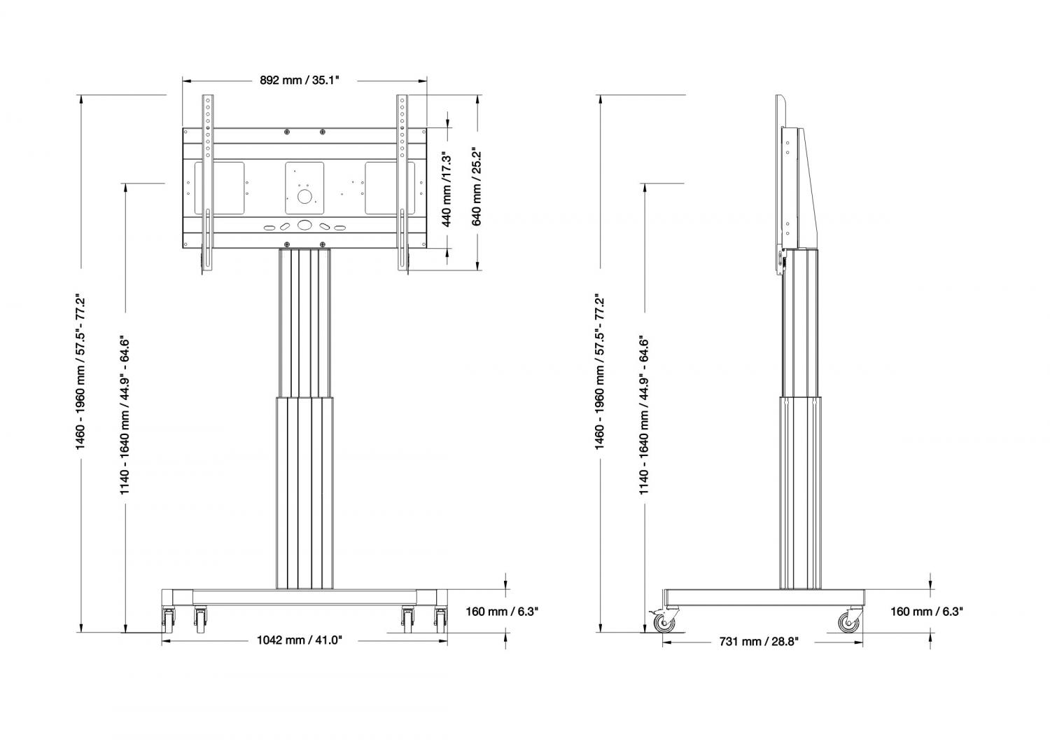Elektrisch in hoogte verstelbare tv-trolley standaard; mobiele monitorstandaard geschikt voor gebruik met alle beeldschermen van 42"-100" schermdiagonaal. Bekend om zijn stabiliteit en veelzijdigheid, is de SCETAVS tv-trolley al jaren een van de wereldwijde bestsellers van Conen Mounts. De mobiele monitorstandaard is ontworpen voor intensief dagelijks gebruik en voor het veilig vasthouden van displays met een schermgrootte tot 100" of 136 kg. Het mobiele montagesysteem SCETAVS is uitgerust met een centrale mastkolom en een 50 cm-hub. De mogelijkheid om tal van accessoires zoals pc-planken, transporthandgrepen en zijvleugels voor whiteboards dragen ook bij aan het vergroten van de gebruiksvriendelijkheid en het verbeteren van de gebruiksmogelijkheden in de trainingsruimte. Het product wordt gedemonteerd geleverd in drie pakketten. Alle verpakkingseenheden zijn geschikt voor pakketdienst.