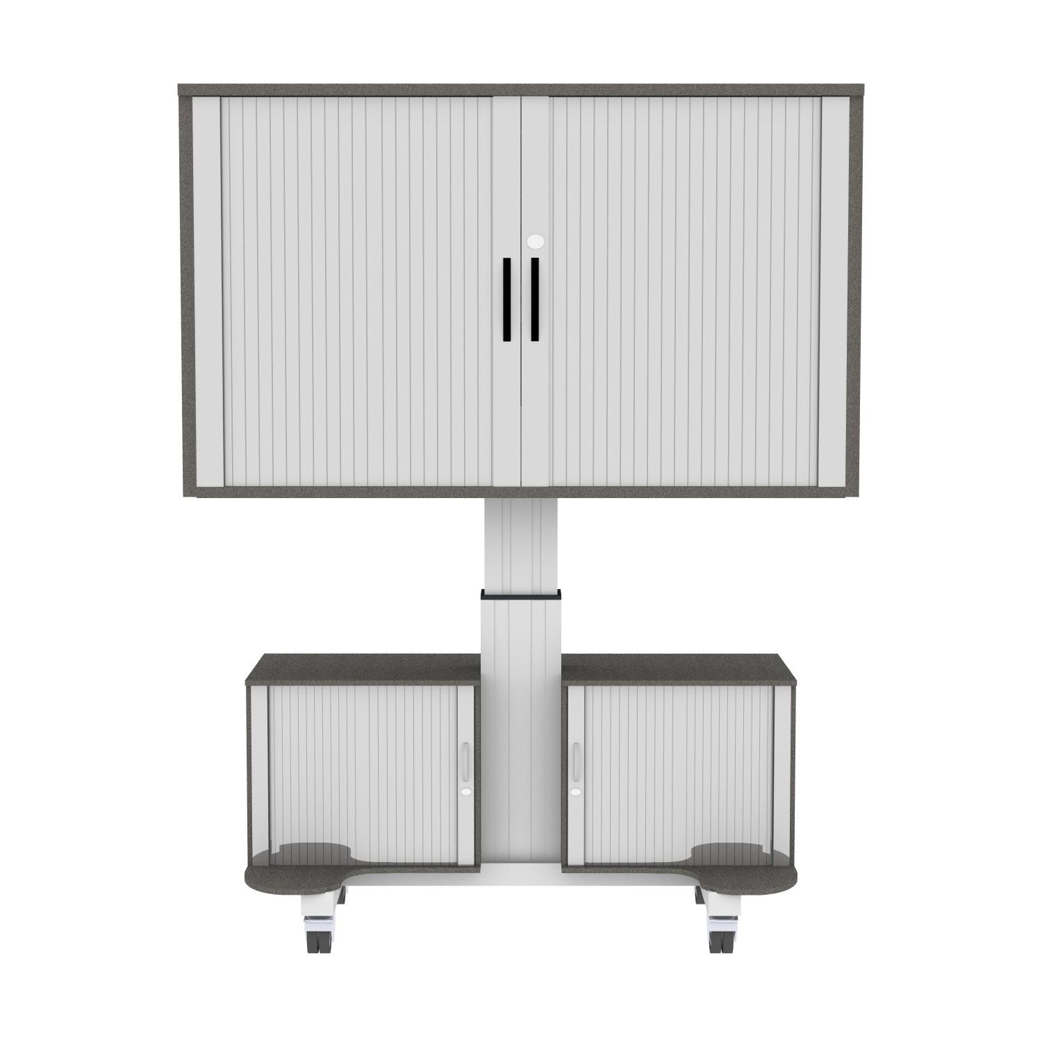 Onze Conen Mounts elektrisch in hoogte verstelbare verrijdbare monitorbeugels met witte tv-rolgordijnkast en twee witte onderkasten voor rolgordijnen zijn eenvoudig in hoogte te verstellen. De tv-rolgordijnkast is voorzien van een zilveren rolgordijn aan de voorzijde en een kabelgeleidingsklep aan de achterzijde. Beide zijden zijn afsluitbaar. De onderkasten voor rolgordijnen bieden voldoende ruimte voor documenten en andere belangrijke gebruiksvoorwerpen voor uw presentatie! De zilveren rolgordijnen aan de voorzijde en de kastdeuren aan de achterzijde kunnen op slot. De rechter onderkast biedt je een uittrekelement voor apparaten zoals notebooks en laptops en een in hoogte verstelbare plank. De linker onderkast heeft nog twee in hoogte verstelbare planken. Een ander voordeel van dit systeem is dat het absoluut onderhoudsvrij is - het hoeft nooit te worden afgesteld, gesmeerd of opnieuw afgesteld. De verrijdbare Conen Mounts tv-rolgordijnkasten hebben 4 lichtlopende wieltjes en zijn daardoor gemakkelijk van kamer naar kamer te vervoeren. Twee van deze wielen kunnen worden vergrendeld om het systeem op de gewenste plaats te fixeren.