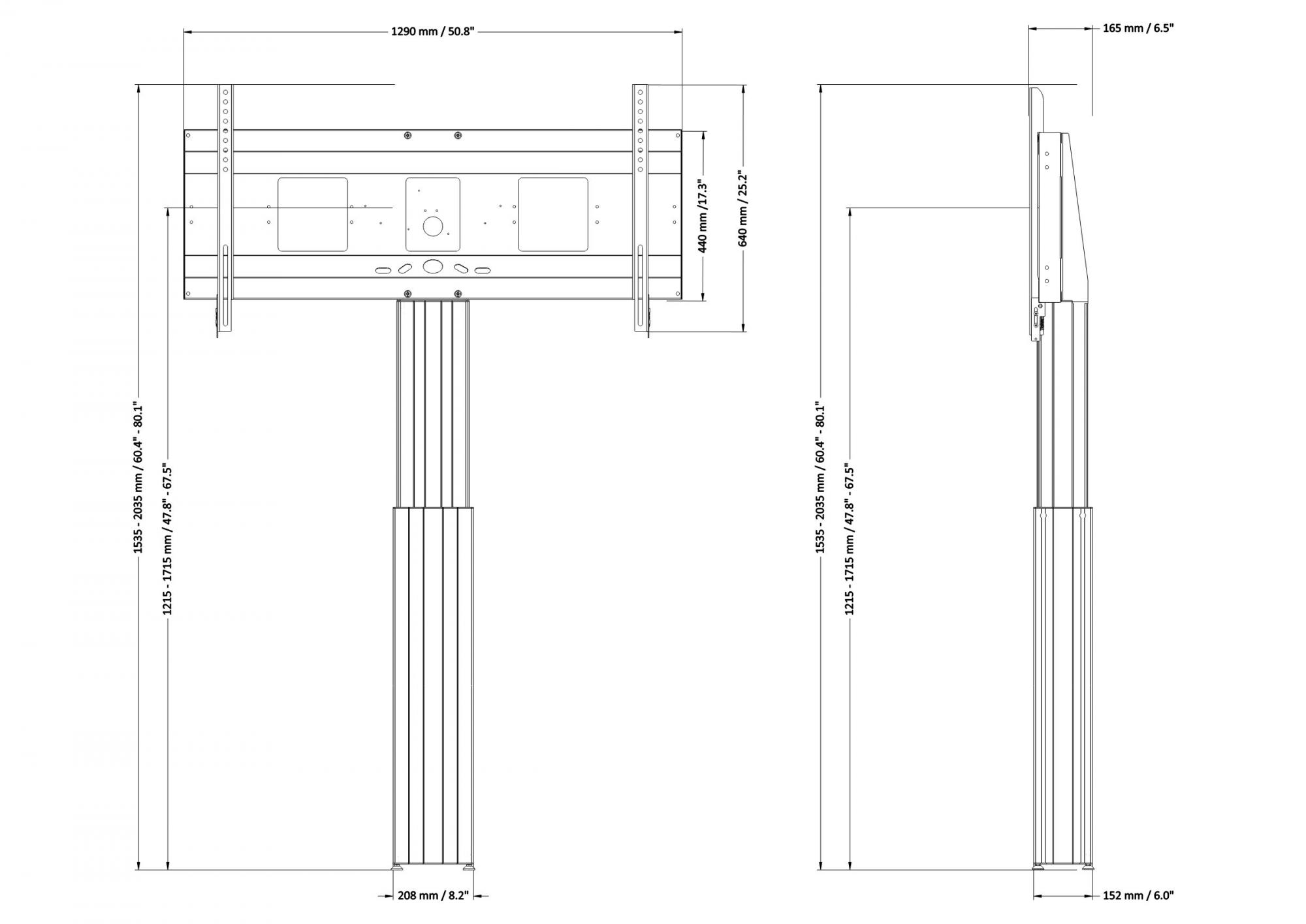 Elektrisch in hoogte verstelbare monitor- standaard; tv-muurbeugel met XL-beeldschermbeugel. Speciaal ontwikkeld voor montage van touchscreen displays. De gemotoriseerde, in hoogte verstelbare tv-muurbeugel is uitgerust met een extra breed frame voor beeldschermmontage. Het systeem wordt geleverd met de 2-delige Conen Mounts mastkolom en 50 cm hoogteverstelling. Het product wordt verder gedemonteerd in 2 pakketten. Elk van de pakketten is geschikt voor koeriersdiensten.