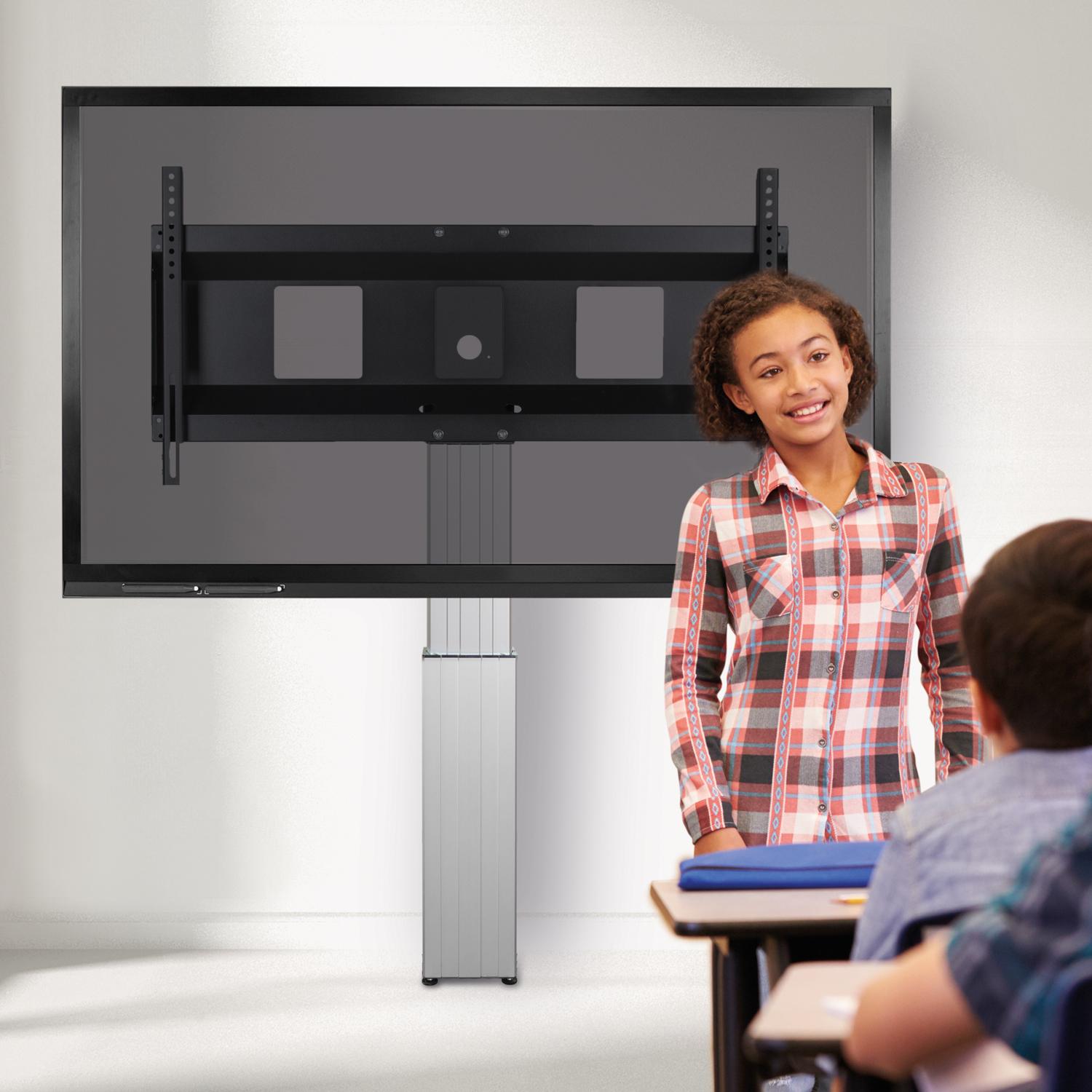 Elektrisch in hoogte verstelbare monitor- standaard; tv-muurbeugel met XL-beeldschermbeugel. Speciaal ontwikkeld voor montage van touchscreen displays. De gemotoriseerde, in hoogte verstelbare tv-muurbeugel is voorzien van een extra breed frame voor beeldschermmontage. Het systeem wordt geleverd met de 2-delige Conen Mounts mastkolom en 50 cm hoogteverstelling. Het product wordt verder gedemonteerd in 2 pakketten. Elk van de pakketten is geschikt voor koeriersdiensten.
