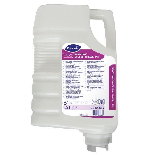 Clax Revoflow DEOSOFT BREEZE is een zeer geconcentreerde wasverzachter op basis van eenvoudig biologisch afbreekbare kationische quaternaire zouten. In de wasoplossing hechten deze positief geladen kationen zich aan het negatief geladen oppervlak van de stof waardoor een smerend effect ontstaat. Tijdens het droogproces voorkomt dit dat de vezels aan elkaar klitten en dat statische elektriciteit zich opbouwt vooral bij synthetische vezels. Clax Revoflow DEOSOFT BREEZE bevat een trendy langdurig parfum dat extra frisheid aan het textiel geeft. Het product kan worden gebruikt voor de meeste soorten textiel maar is bijzonder effectief op volumineuze of gestructureerde stoffen zoals handdoeken. Daarnaast maakt Clax Revoflow DEOSOFT BREEZE geweven en vlakgebreide stoffen glad en zijdezacht.