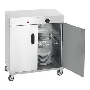 Verrijdbaar dubbelwandig roestvrijstaal en geheel geïsoleerd 2 roosters met thermostaat en controlelampje compleet met 4 zwenkwielen waarvan 2 geremd geschikt voor borden max. 32 cm H cm:80 L cm:72 B cm:44 V:230 W:1000 Cap.:80