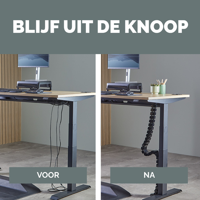 Organiseer en leid kabels moeiteloos van de vloer naar het bureau met deze kabelslang voor een schone, opgeruimde werkplek. Flexibele slang past zich aan aan bureaus (tot 130cm) die in hoogte verstelbaar zijn en beweegt naadloos mee als de bureauhoogte verandert. Vier gescheiden compartimenten houden kabels vrij van wirwar, terwijl de open slang gemakkelijk kabels kan toevoegen of verwijderen. Afneembare onderdelen - 31- in elkaar te klikken delen zodat je de hoogte kunt aanpassen aan je bureau. Verzwaarde voetplaat voor extra stabiliteit. Ingebouwde magneet bevestigt de kabelslang aan de tafelpoot, zodat hij niet in de weg zit. Eenvoudig te installeren met magneet of schroefbevestiging. Gebouwd om lang mee te gaan met 5 jaar garantie.