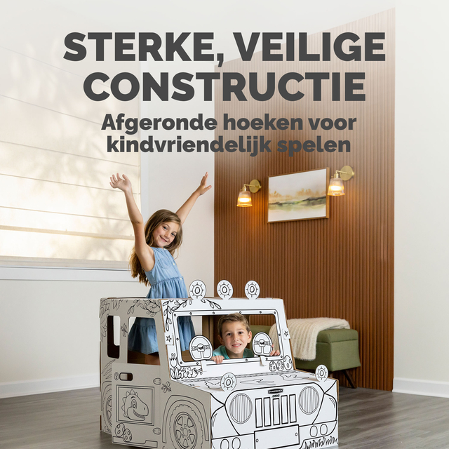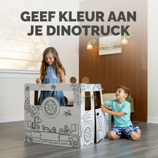 * Brul het avontuur tegemoet met een inkleurbare dinosaurustruck! * Vol met prehistorische details - klaar om door kinderen gepersonaliseerd te worden. * Perfect voor fantasierijk spel: fossielenjachten en dino-reddingsmissies. * Interactieve deuren en uitgesneden ramen brengen het spel tot leven. * Gemaakt van stevig FSC®-gecertificeerd karton en eenvoudig op te zetten zonder lijm of gereedschap. * Veilig voor kinderen: afgeronde randen, bedrukt met watergedragen inkten, volledig CE/UKCA-gecertificeerd. * Afmetingen volledig opgebouwd (HxBxD): 81,5x79,5x97,7cm.