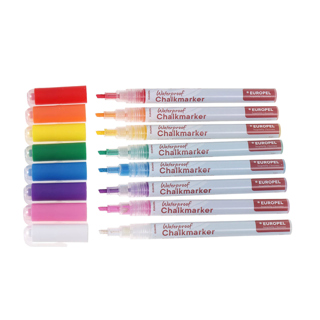 * Ontdek de watervaste krijtstiften 6mm in een 8 kleuren assortiment etui, perfect voor al je creatieve projecten. * Deze set bevat 8 levendige kleuren: rood, paars, blauw, oranje, roze, geel, groen en wit. * Ideaal voor het maken van opvallende borden, raamdecoraties en kunstwerken. * De 3-6mm punt maakt zowel bredere als smalle lijnen mogelijk, afhankelijk van de hoek waarin je de stift houdt. * De watervaste inkt zorgt ervoor dat je ontwerpen helder blijven, zelfs bij blootstelling aan water. * Dit maakt ze ideaal voor gebruik op buitenborden, ramen en andere oppervlakken die kunnen worden blootgesteld aan weersomstandigheden. * Je ontwerpen en boodschappen blijven helder en duidelijk, ongeacht de omstandigheden. * Deze stiften zijn gemaakt van niet-giftige materialen, snel drogend en geurloos, wat ze veilig en gebruiksvriendelijk maakt. * Of je nu een kleurrijk menu voor een café wilt maken, een opvallend raamdisplay wilt ontwerpen, of gewoon wil experimenteren met verschillende kleuren in je kunstwerken, deze set heeft alles wat je nodig hebt. * De intense, dekkende kleuren zorgen ervoor dat je ontwerpen echt tot leven komen.