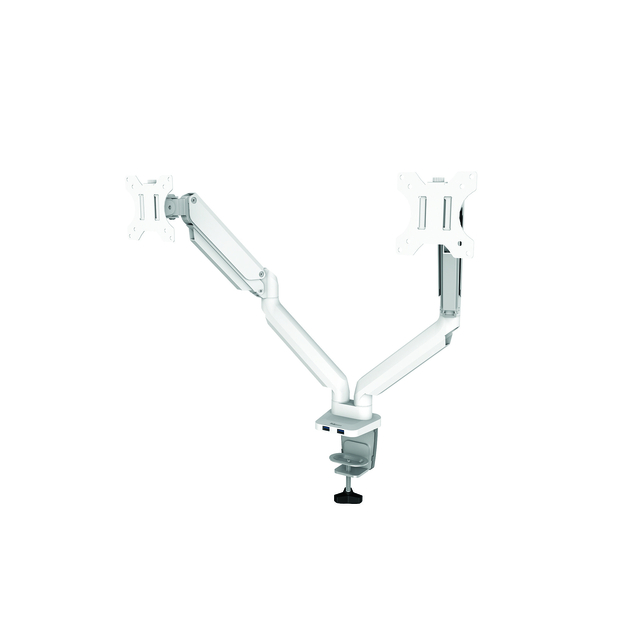 * Vergroot waardevolle ruimte op het bureau en verstel makkelijk het monitor om zo spanning op de nek, schouders en ogen te verminderen. * Volledig onafhankelijk beweegbare monitorarmen voor het gebruik van twee beeldschermen. * De gasveer technologie biedt moeiteloze aanpassing voor het samenwerken en delen van de informatie op de schermen. * Elke arm kan een beeldscherm tot 9kg dragen (maximaal 27"). * Met de geïntegreerde 3.0 USB-poorten bent u verbonden met al uw favoriete apparaten. * Kabels kunnen eenvoudig en netjes weggewerkt worden. * Eenvoudig bevestigen door middel van een klem of ring. * VESA 75x75 en 100x100. * Rotatie 360°. * Pan: 180°. * Kantelen: +85°/-85°. * Maximale breedte: 850.9cm. * Maximale afstand: 49.53cm. * Maximale hoogte: 39.37cm. * Getest door FIRA International Ltd om te voldoen aan de ergonomische eisen die zijn vastgelegd in de Europese gezondheids- en veiligheidswetgeving: EN ISO 9241-5.