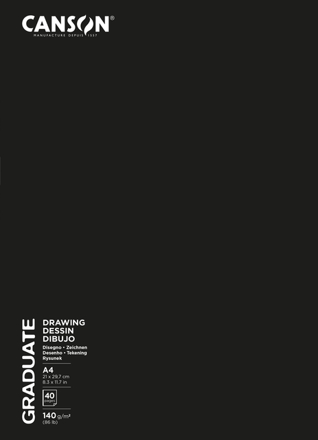 Canson Graduate Sketch & Drawing is een A4 tekenboek met soepele zwarte cover, geniet met 20 vel wit lichtgekorreld papier 140 gr.