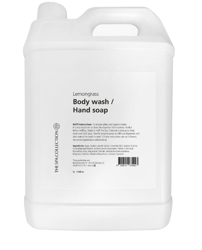 Maak kennis met de 5 liter navuljerrycan met lemongrass geur van The Spa Collection: Verrijk je verzorgingroutine met de verkwikkende geur van lemongrass. De 5 liter jerrycan is ontworpen om de body wash of handzeep 400 ml flessen van The Spa Collection Lemongrass na te vullen voor een duurzame en verfrissende douche-ervaring.