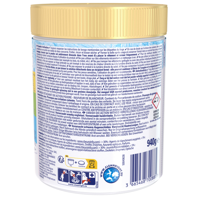 * Verleng de levensduur van je witte kleding met de verbeterde multi-voordeel formule van Vanish Oxi Action whitening wasbooster vlekverwijderaar, de bleekvrije booster die de glans van je witte kleding verbetert. * Verwijdert hardnekkige vlekken zelfs in koud water. * Herstelt wit zelfs bij 20°C. * Doeltreffend zelfs na 50 wasbeurten. * Verwijdert sterke geuren. * Biedt een perfecte hygiëne. * Een dosis in elke wasbeurt voor kleding die langer meegaat! * Gevarenaanduidingen: H272, cat. 2 en 3: Kan brand bevorderen; oxiderend. H302, cat. 4: Schadelijk bij inslikken. H315, cat. 2: Veroorzaakt huidirritatie. H318, cat. 1: Veroorzaakt ernstig oogletsel. H319, cat. 2A: Veroorzaakt ernstige oogirritatie. H400, cat. 1: Zeer giftig voor in het water levende organismen. H412, cat. 3: Schadelijk voor in het water levende organismen, met langdurige gevolgen. * Veiligheidsaanbevelingen: P101: Bij het inwinnen van medisch advies, de verpakking of het etiket ter beschikking houden. P102: Buiten het bereik van kinderen houden. P103: Alvorens te gebruiken, het etiket lezen.