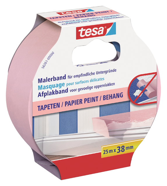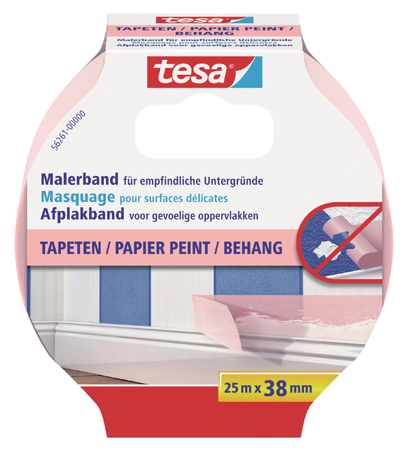 * tesa® Afplaktape voor behang is een extra dun washi papieren tape die speciaal is ontwikkeld voor kwetsbare oppervlakken zoals duur behang. * tesa® Afplaktape voor behang is een extra dunne, papieren tape die speciaal is ontwikkeld voor veilig gebruik op kwetsbare oppervlakken. * Hij heeft een oplosmiddelvrije lijmcoating die niet alleen perfecte hechting op elk glad oppervlak biedt, maar tot 7 dagen na aanbrengen kan worden verwijderd zonder schade of lijmresten achter te laten. * tesa® Schilderstape WASHI SENSITIVE ecoLogo® voor kwetsbare ondergronden. * Lengte 25mx38mm