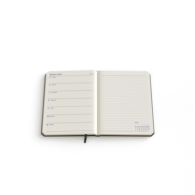 de KEMPEN planner Weekly Notes eentalig Engels met 1 week per 1 pagina en een notitiepagina. Boekgebonden agenda met chamois papier, schuine hoekjes, kleur op snee en een leeslint, volledig vlakliggend, in een aangename en soepele PU omslag op formaat 11 x 16 cm. De kleuren worden in willekeur uitgeleverd.