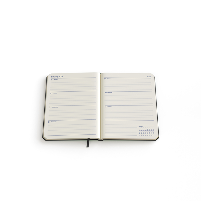 de KEMPEN planner Weekly Planner eentalig Engels met 1 week per 2 pagina's. Boekgebonden agenda met chamois papier, schuine hoekjes, kleur op snee en een leeslint, volledig vlakliggend, in een aangename en soepele PU omslag op formaat 11 x 16 cm. De kleuren worden in willekeur uitgeleverd.