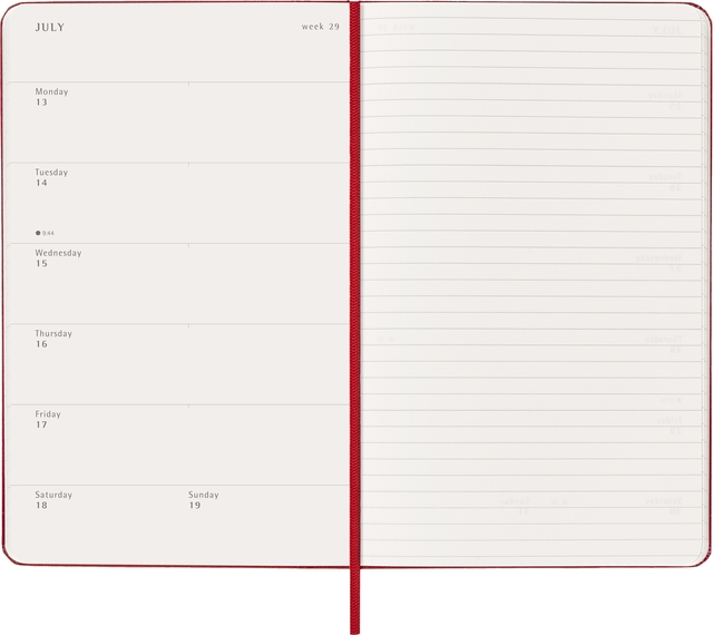 De Moleskine Weekly Notebook Planner is gedateerd van januari tot december. Het is een handige en veelzijdige planner die de vrijheid van een notitieboekje bevat en is ingedeeld met de afspraken van de week aan de linkerkant en een gelinieerde pagina voor notities op de rechter bladzijde. Het notitieboekje is beschikbaar met een harde of een zachte kaft met afgeronde hoeken en een elastische sluiting. - Harde kaft - Afgeronde hoeken - Elastische sluiting - Moleskine ivoorkleurig papier - Papiergewicht: 70 g/m² - Handige tools: planning, tijdzones, internationale metingen, toegangscodes en vluchtduur - Uitbreidbaar binnenvak passend bij de kleur van het notebook - "In geval van verlies" label gedrukt op het schutblad - Bijpassende bladwijzer voor lint - Herbruikbare paperband B-SIDE met extra gedrukte tools - 180° liggende opening - Moleskine srl. creëert en verkoopt FSC-gecertificeerde producten