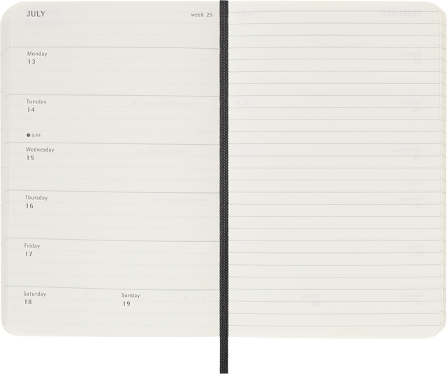 De Moleskine Weekly Notebook Planner is gedateerd van januari tot december. Het is een handige en veelzijdige planner die de vrijheid van een notitieboekje bevat en is ingedeeld met de afspraken van de week aan de linkerkant en een gelinieerde pagina voor notities op de rechter bladzijde. Het notitieboekje is beschikbaar met een harde of een zachte kaft met afgeronde hoeken en een elastische sluiting. - Zachte kaft - Afgeronde hoeken - Elastische sluiting - Moleskine ivoorkleurig papier - Papiergewicht: 70 g/m² - Handige tools: planning, tijdzones, internationale metingen, toegangscodes en vluchtduur - Uitbreidbaar binnenvak passend bij de kleur van het notebook - "In geval van verlies" label gedrukt op het schutblad - Bijpassende bladwijzer voor lint - Herbruikbare paperband B-SIDE met extra gedrukte tools - 180° liggende opening - Moleskine srl. creëert en verkoopt FSC-gecertificeerde producten