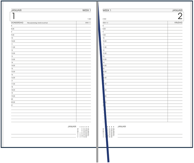 * 13,5x21cm. * Hoekperforatie. * 70gr papier. * Nederlandstalig. * Maandkalender op elke pagina. * Extra ruimte voor notities en telefoontjes. * Garengebonden. * Gewatteerde kunstlederen omslag.