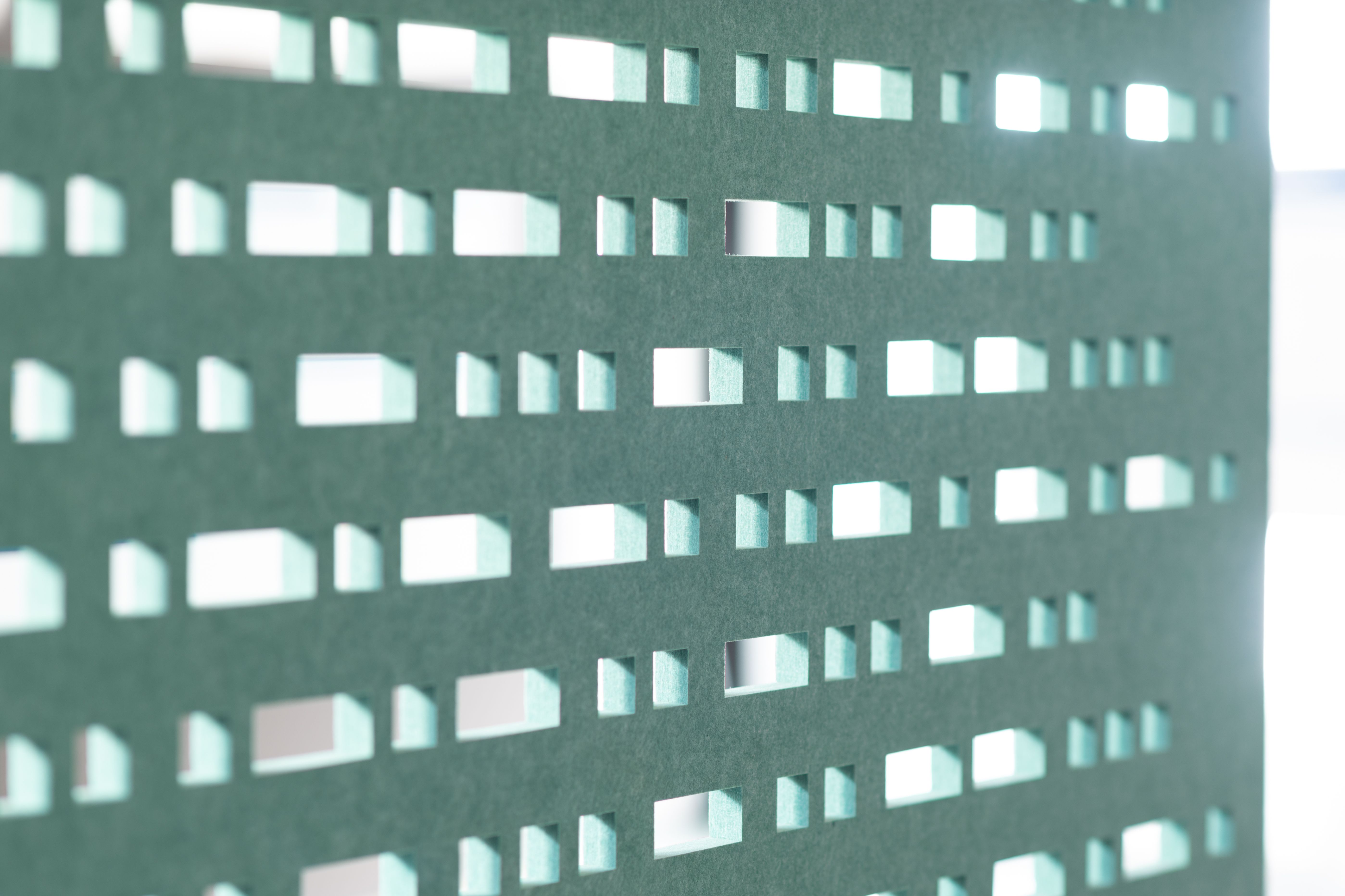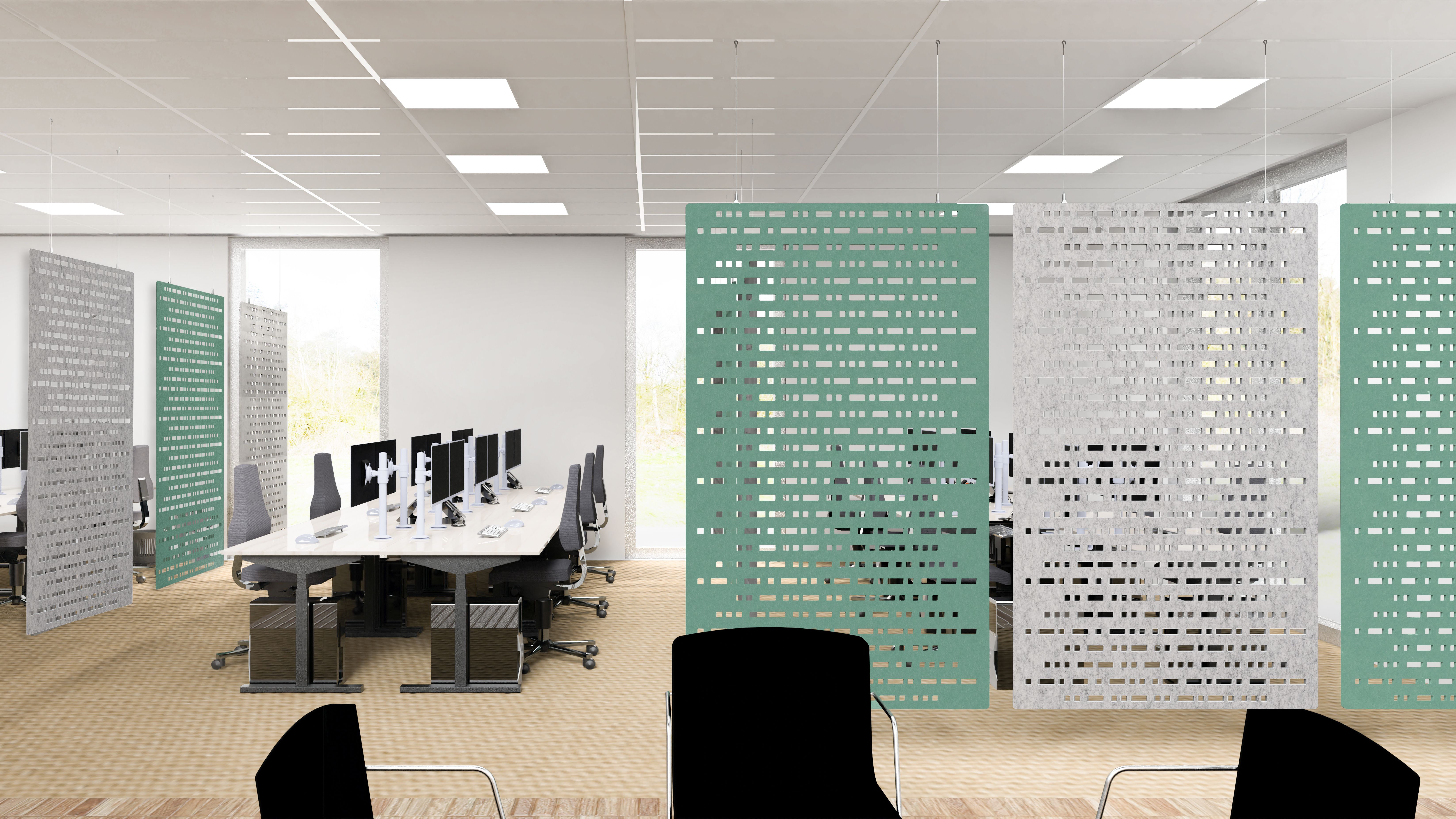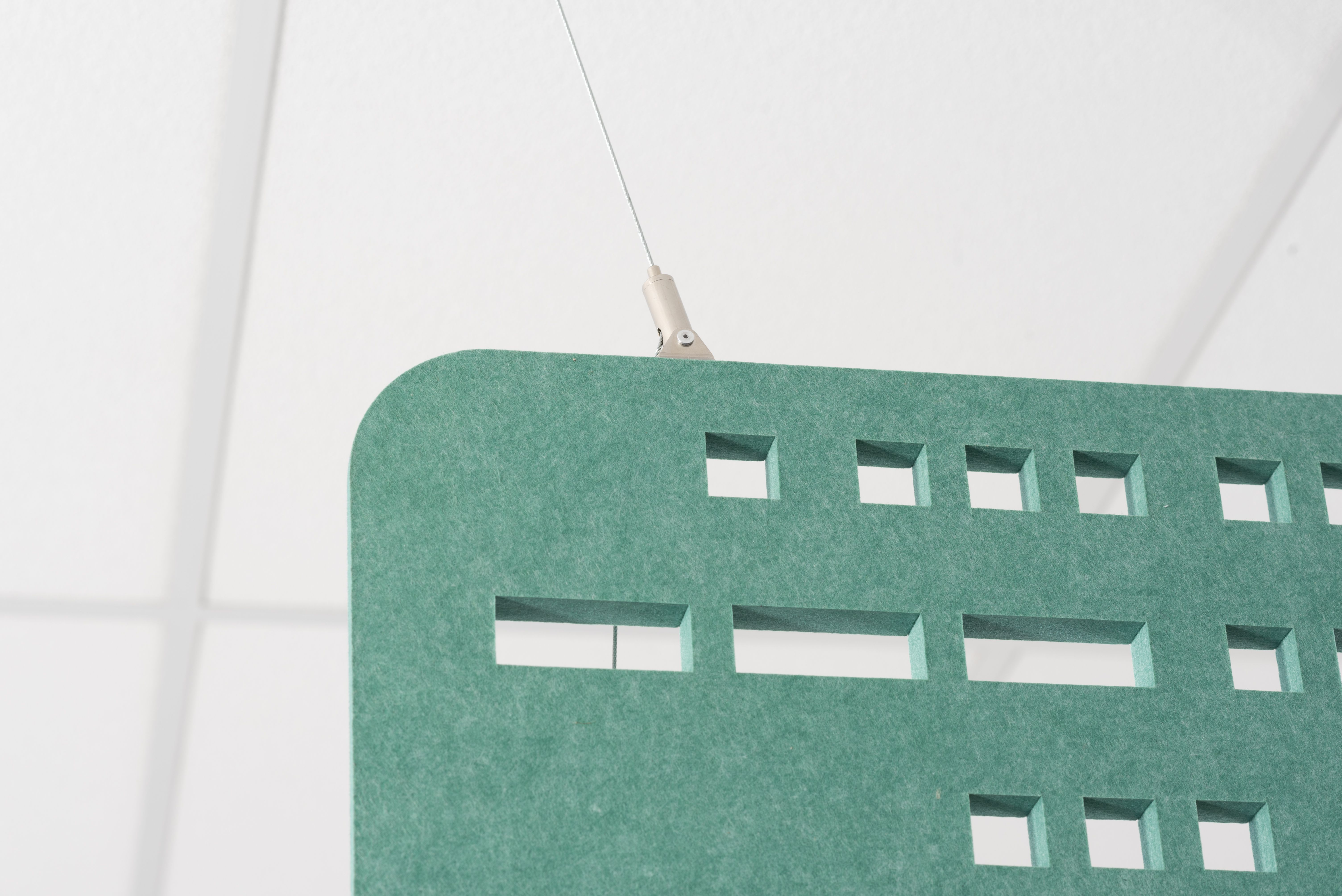 Petrol' groene akoestische scheidingswand van 18 mm dik vilt met doorkijkpatroon. Het vilt absorbeert hinderlijke nagalm en schelle geluiden. Meegeleverde montage voor zowel systeemplafond als vast plafond. Ophang is in hoogte verstelbaar tot maximaal 2 meter onder het plafond. Het vilten materiaal is duurzaam doordat het is gemaakt van gerecyclede PET-flessen. • Paneelmaat: 120x200 cm • Doorkijkpatroon zorgt voor behoud van ruimtelijkheid • Eenvoudig op te hangen • Lichtgewicht materiaal