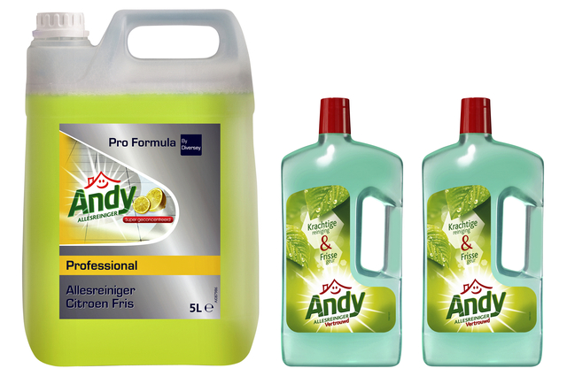 Andy vloeibare allesreiniger is geschikt voor het reinigen van bijna alle soorten oppervlakken in en om het huis of je kantoor. De vernieuwde Andy is beschikbaar in vier heerlijke geuren - die stuk voor stuk een verrukkelijk verfrist gevoel geven - en een variant voor hout en laminaat. Andy kun je snel en voordelig online bestellen bij KantoorArtikelen.nl.