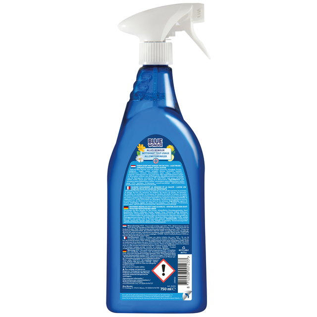 * Gebruik Blue Wonder voor uw keuken, aanrecht, afzuigkap, fornuis, bakplaat, vloerbedekking, meubelstof, tegels, ramen, spiegels, deuren, houtwerk, meubels, speelgoed, afvalemmers, caravan, tuinmeubelen, boot, velgen, auto-interieur, motoren, ruitensproeier, vlekken op wasbare kleding en nog veel meer. * Met deze krachtige reiniger maak je alles goed schoon. Deze allesreiniger laat een langdurige frisse geur van Spring Flowers achter. * Alle oppervlakteactieve stoffen in dit product voldoen aan de Biologische afbreekbaarheidsvoorschriften van de Detergenten verordening EG 648/2004. * Bevat geen chloor en is dierproefvrij. * Gevarenaanduidingen: H290, cat. 1: Kan bijtend zijn voor metalen. H301, cat. 3: Giftig bij inslikken. H302, cat. 4: Schadelijk bij inslikken. H310, cat. 1 en 2: Dodelijk bij contact met de huid. H311, cat. 3: Giftig bij contact met de huid. H314, cat. 1A, 1B en 1C: Veroorzaakt ernstige brandwonden en oogletsels. H315, cat. 2: Veroorzaakt huidirritatie. H317, cat. 1: Kan een allergische huidreactie veroorzaken. H318, cat. 1: Veroorzaakt ernstig oogletsel. H319, cat. 2A: Veroorzaakt ernstige oogirritatie. H330, cat. 1 en 2: Dodelijk bij inademing. H331, cat. 3: Giftig bij inademing. H400, cat. 1: Zeer giftig voor in het water levende organismen. H410, cat. 1: Zeer giftig voor in het water levende organismen, met langdurige gevolgen. * Veiligheidsaanbevelingen: P101: Bij het inwinnen van medisch advies, de verpakking of het etiket ter beschikking houden. P102: Buiten het bereik van kinderen houden. P264: Na het werken met dit product ... grondig wassen. P280: Beschermende kledij dragen. P305+P351+P338: BIJ CONTACT MET DE OGEN: voorzichtig afspoelen met water gedurende een aantal minuten; contactlenzen verwijderen, indien mogelijk; blijven spoelen. P337+P313: Bij aanhoudende oogirritatie: een arts raadplegen.