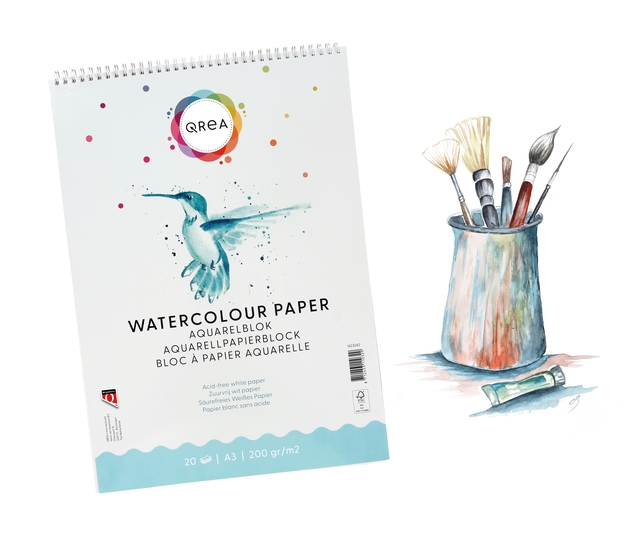 * Of je nu een beginner bent of een professionele kunstenaar, dit aquarelblok van Qrea is geschikt voor iedereen! * Ideaal papier voor de eerste stappen in het aquarelleren en andere natte technieken.* Dit aquarelblok heeft een dubbele spiraal. * Het bevat zuurvrij papier, dat niet vergeelt niet na verloop van tijd. * Het harde karton aan de onderkant zorgt voor optimaal gebruiksgemak. * Afmeting: A4 formaat. * Blok à 20 vellen 200 grams papier. * Diverse formaten beschikbaar. * Geproduceerd in Nederland.
