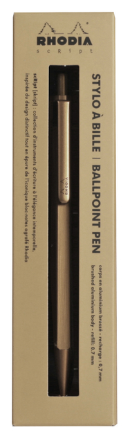 * Rhodia scRipt balpen 0,7 mm * De Rhodia schrijfinstrumenten zijn authentiek en tijdloos, eenvoudig en verfijnd. * Zeshoekig lichaam in geborsteld aluminium, intrekbare precisiepunt van 0.7mm, verpakt in kartonnen doosje met venster.