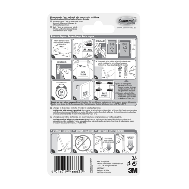 * Command™ Grote bevestigingsstrips zijn onze innovatieve oplossing voor het veilig en zonder beschadigingen ophangen van grotere of zwaardere ingelijste afbeeldingen en kunstwerken. Ze hechten sterk en laten na verwijdering geen sporen achter dankzij de 3M rekontgrendelingstechnologie. * Hangt zonder beschadigingen op, hecht stevig en laat na verwijderen geen sporen achter. * Gemakkelijk aan te brengen: er zijn geen spijkers, schroeven of boren nodig. * De strips laten zich door uitrekken schoon verwijderen zonder gaten, vlekken of lijmresten achter te laten. * Geschikt voor de meeste gladde oppervlakken zoals geschilderde wanden, tegels, metaal en hout. * Houd lijsten vlak en veilig aan de wand; de onopvallende strips blijven verborgen achter de lijst. * De strips kunnen vergrendeld en ontgrendeld worden, dus de lijst kan verplaatst en opnieuw opgehangen worden. * Draagvermogen: De 4 sets strips in deze verpakking kunnen een lijst dragen met een gewicht tot 7,2 kg en afmetingen tot 60x90 cm.