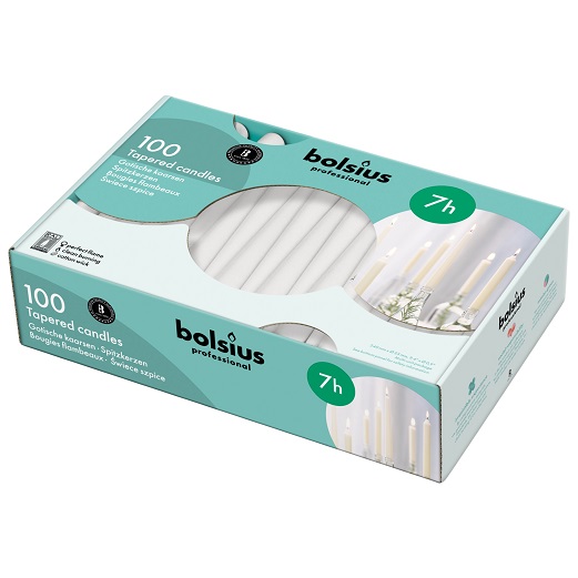 Topkwaliteit gotische kaarsen van Bolsius Professional. Kleur: Wit Branduren: Ca. 7 Afmeting: 23x240 mm Verpakking: Doos 2x100 stuks