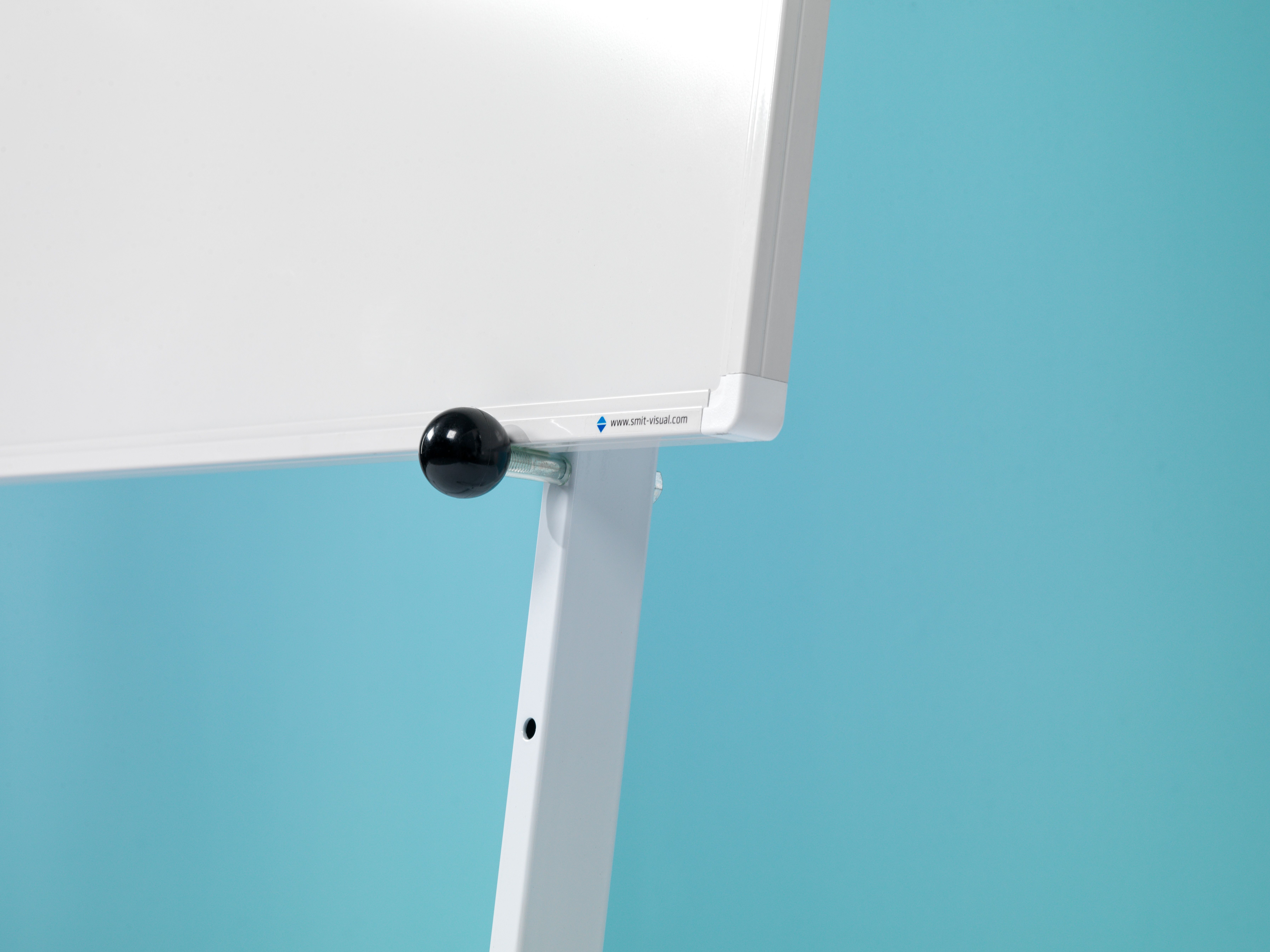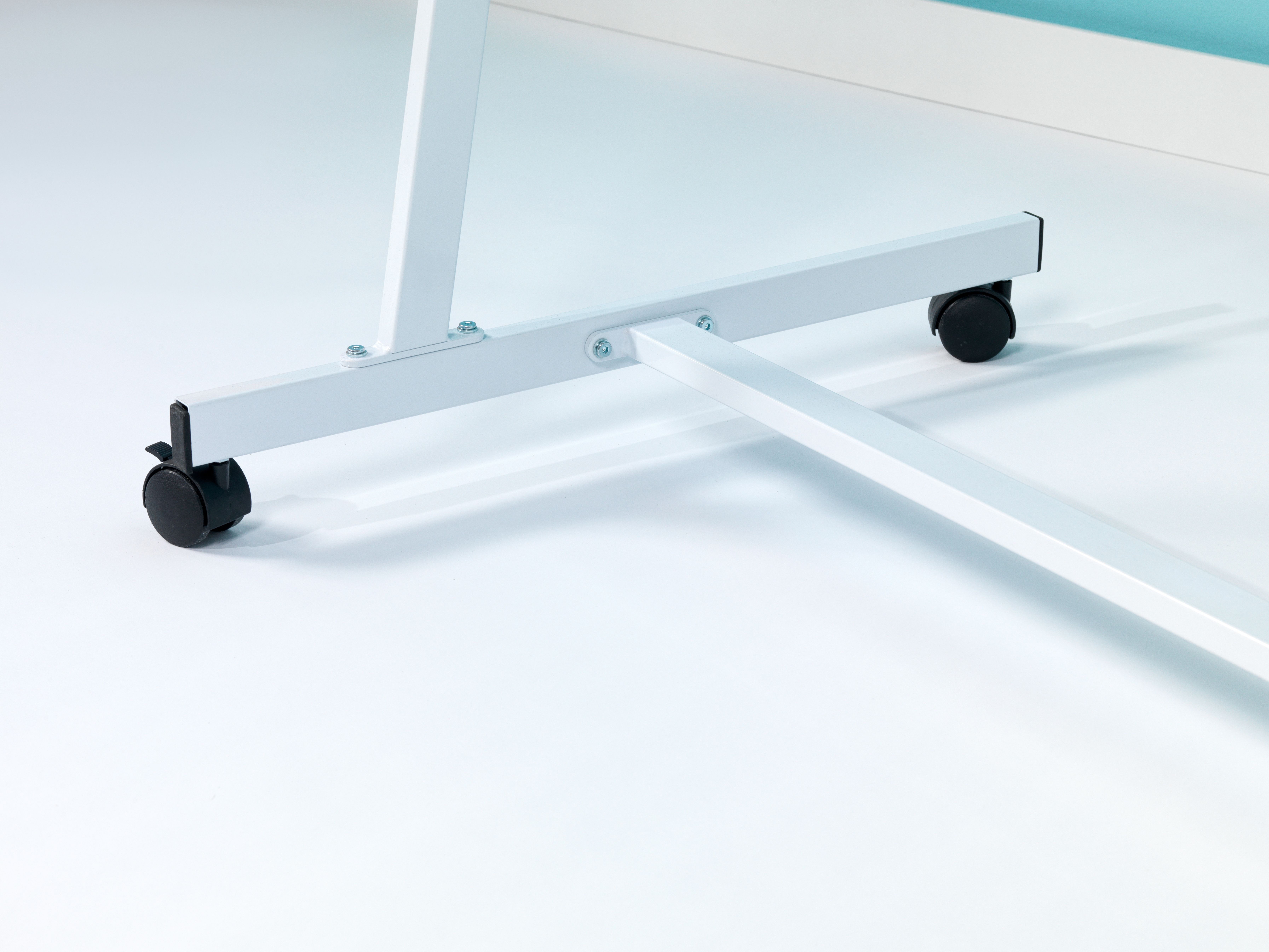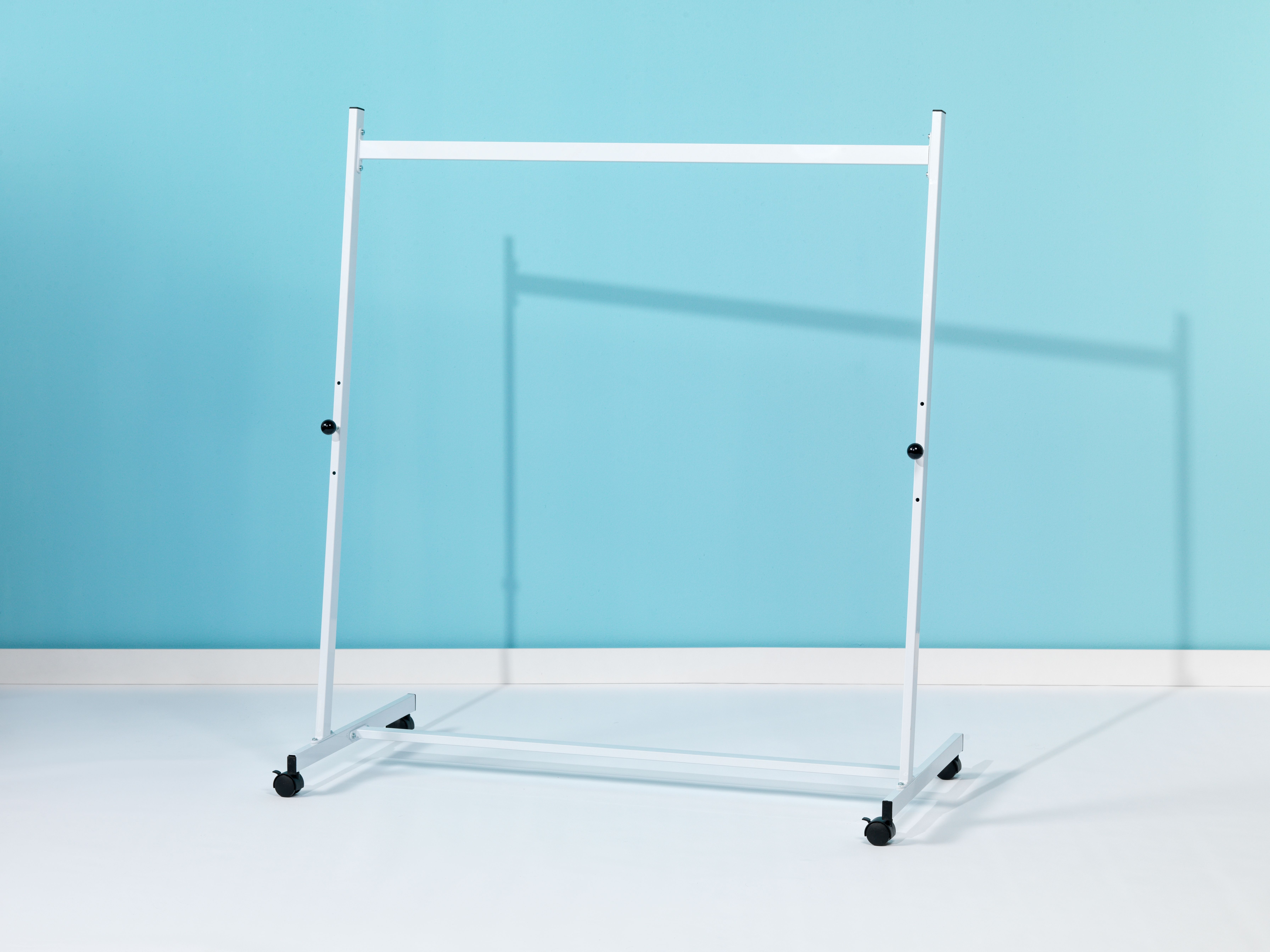 Wit stalen bordenstandaard op 4 wielen (2 met rem). Borden kunnen op drie hoogtes geplaatst worden. Maximale afmetingen bord op standaard 90 cm: 100x150 cm ( hxb) en op standaard 140 cm: 100x180 cm (hxb).