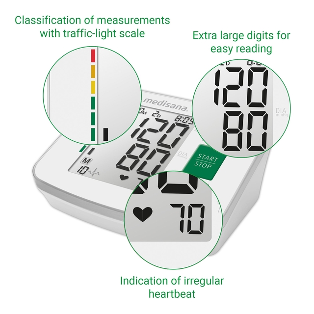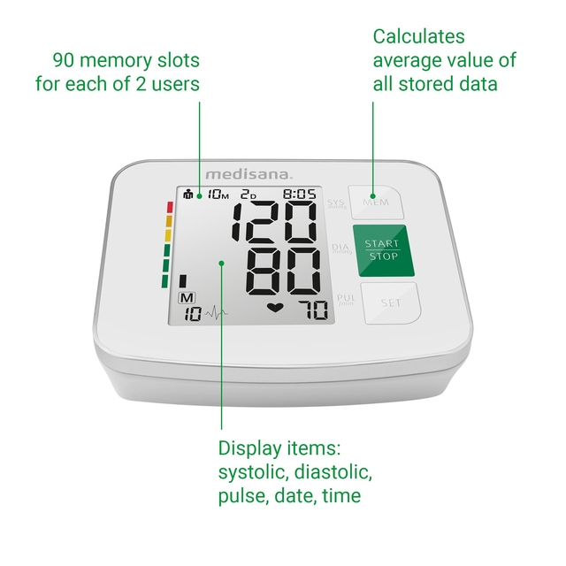 * De BU 512 bovenarmbloeddrukmeter van medisana maakt indruk met zijn ongecompliceerde bediening. Het digitale display informeert u in één oogopslag over de datum, tijd, polsslag, systole en diastole. De huidige meetwaarden worden geëvalueerd met behulp van een stoplichtkleurenschaal. Indien gewenst kan het apparaat een gemiddelde waarde berekenen van alle opgeslagen metingen. De BU 512 bovenarmbloeddrukmeter van medisana heeft ook een display dat een onregelmatige hartslag kan aangeven.